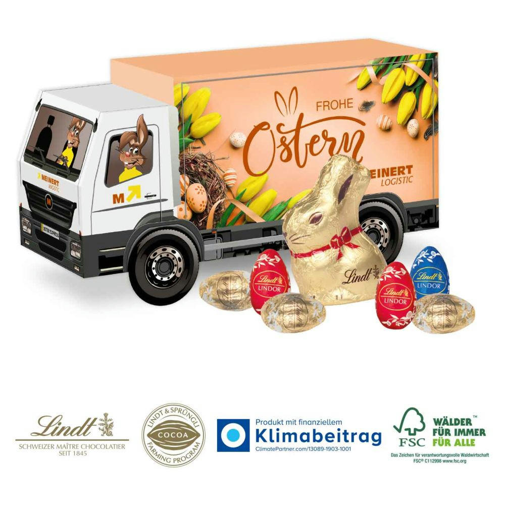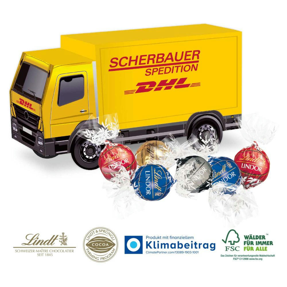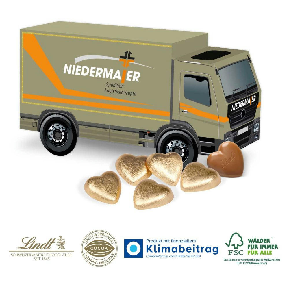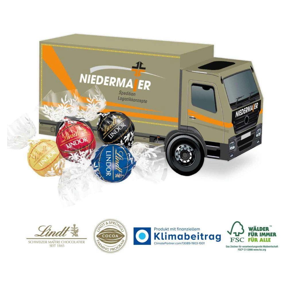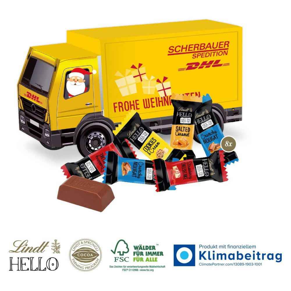 Beliebtes Firmenpräsent zum attraktiven Preis! Die beliebten 3D-Modelle „LKW“ oder „Transporter“ sind individuell in Ihrem Firmendesign bedruckbar. Eine Füllung mit feinster Markenschokolade sorgt für himmlische Genussmomente. Dieses Firmenpräsent findet bestimmt einen Ehrenplatz in den Büros Ihrer Kunden und Mitarbeiter. Produktdetails: Individuelle Präsentverpackung aus hochwertiger Kartonage mit süßer Füllung. Das Lindt & Sprüngli Farming-Programm steht für nachhaltige Kakaobohnen-Beschaffung (www.farming-program.com). // Inhalt: 12 Stück Lindt Minis (ca. 55 g) und ein zartschmelzender Lindt Weihnachtsmann (10 g). Geschmacksrichtungen bunt gemischt