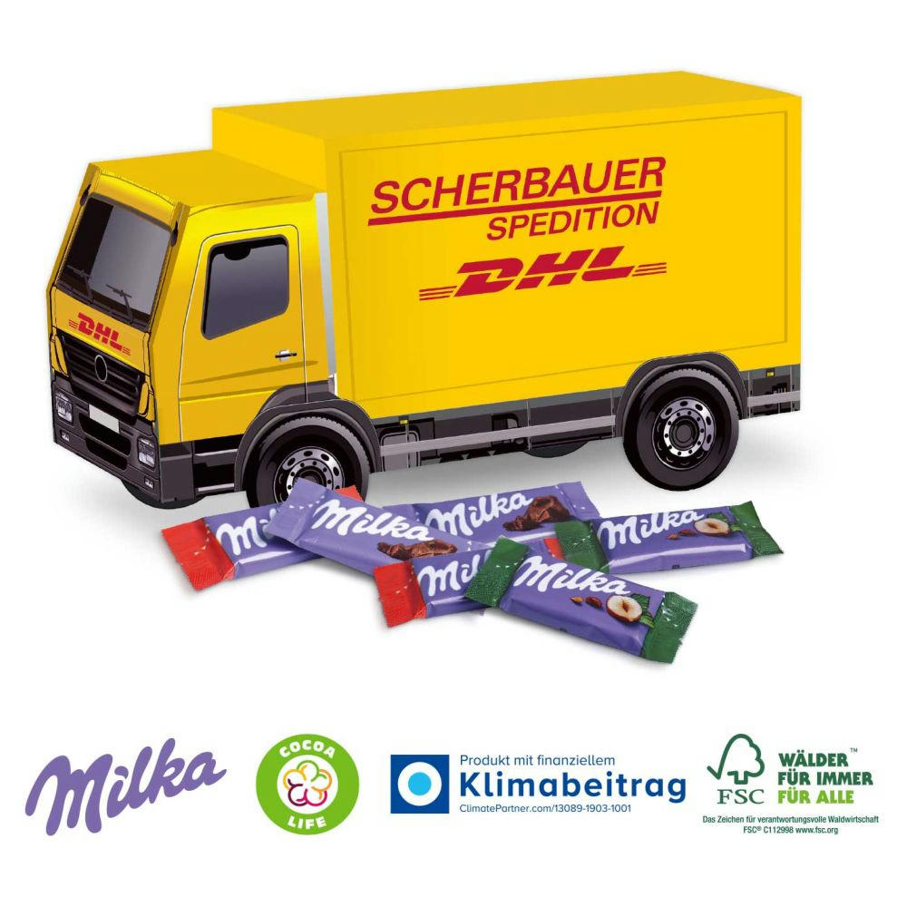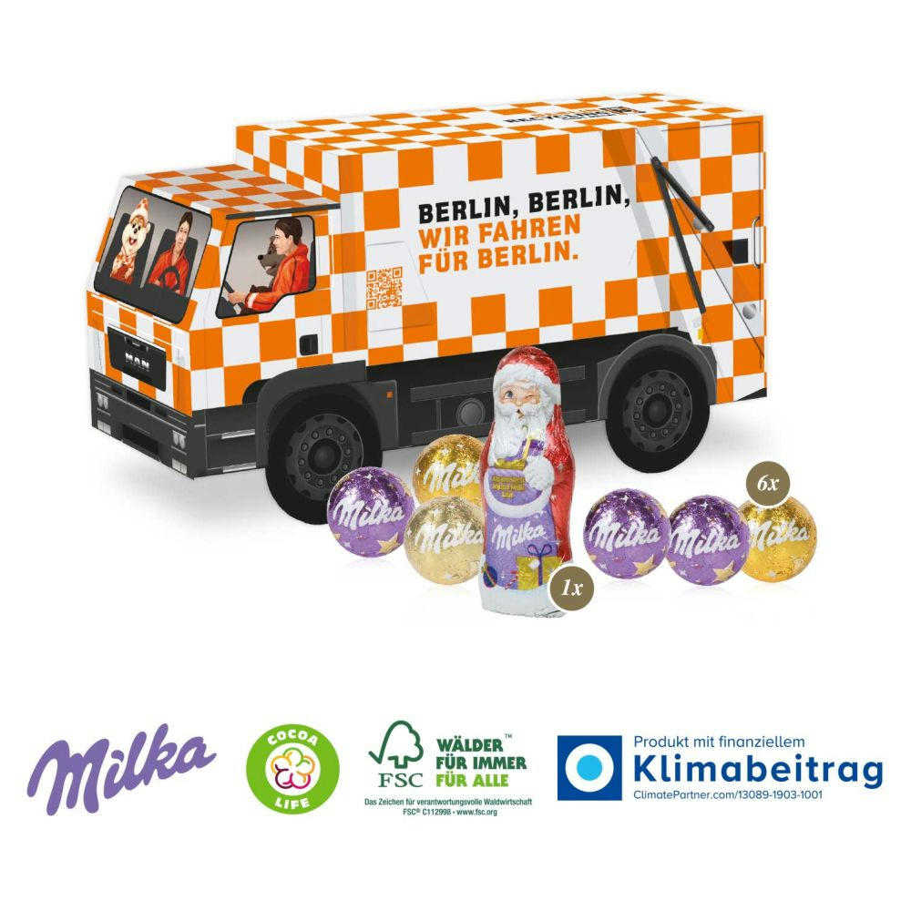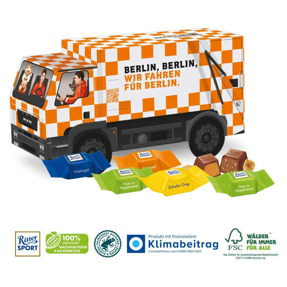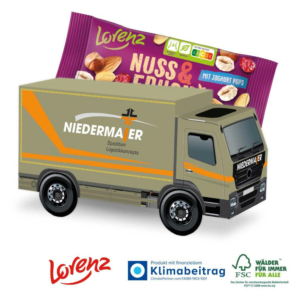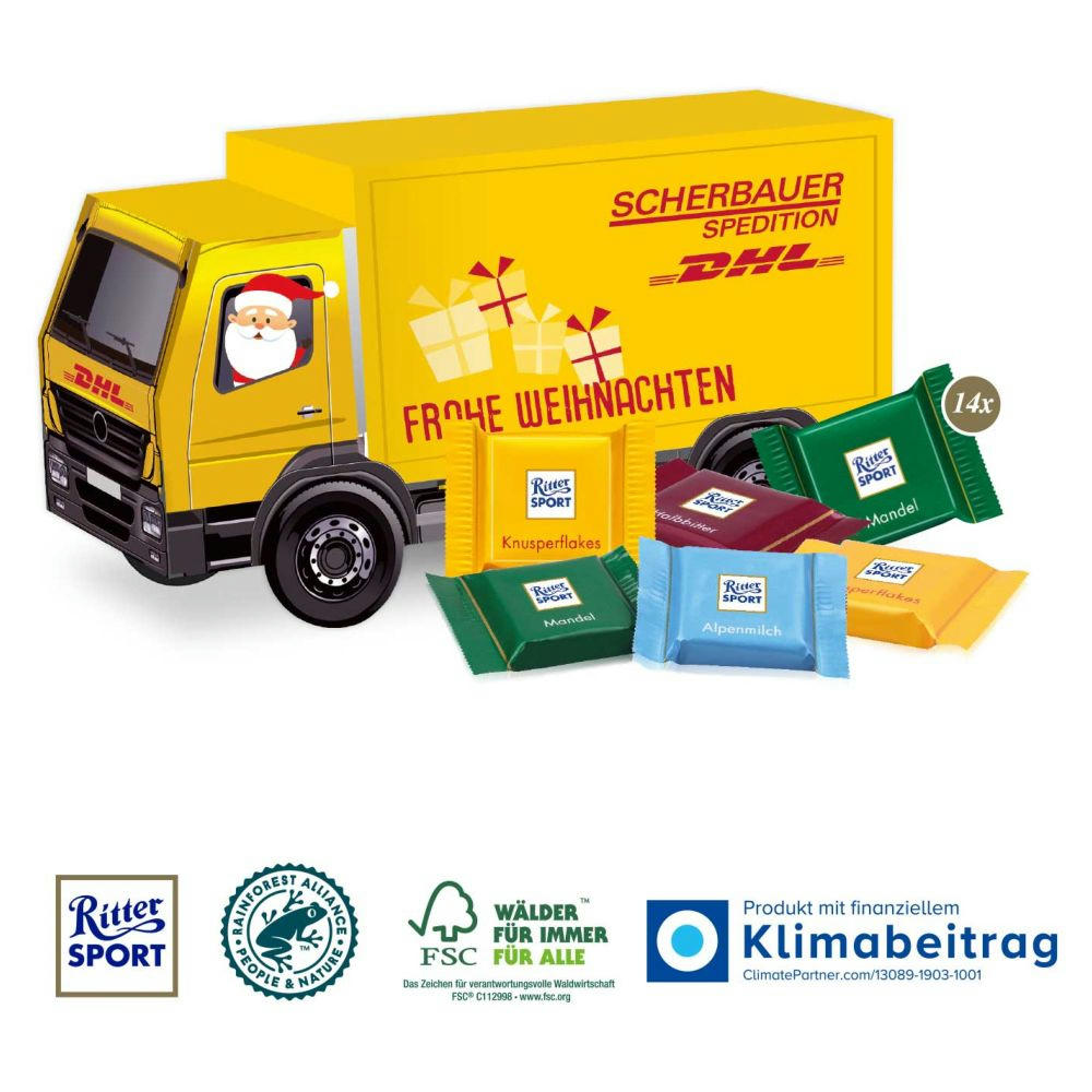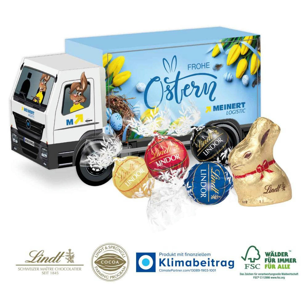 Beliebtes Firmenpräsent zum attraktiven Preis! Die beliebten 3D-Modelle „LKW“ oder „Transporter“ sind individuell in Ihrem Firmendesign bedruckbar. Eine Füllung mit feinster Markenschokolade sorgt für himmlische Genussmomente. Dieses Firmenpräsent findet bestimmt einen Ehrenplatz in den Büros Ihrer Kunden und Mitarbeiter. Produktdetails: Individuelle Präsentverpackung aus hochwertiger Kartonage mit süßer Füllung. Das Lindt & Sprüngli Farming-Programm steht für nachhaltige Kakaobohnen-Beschaffung (www.farming-program.com). // Inhalt: 12 Stück Lindt Minis (ca. 55 g) und ein zartschmelzender Lindt Weihnachtsmann (10 g). Geschmacksrichtungen bunt gemischt