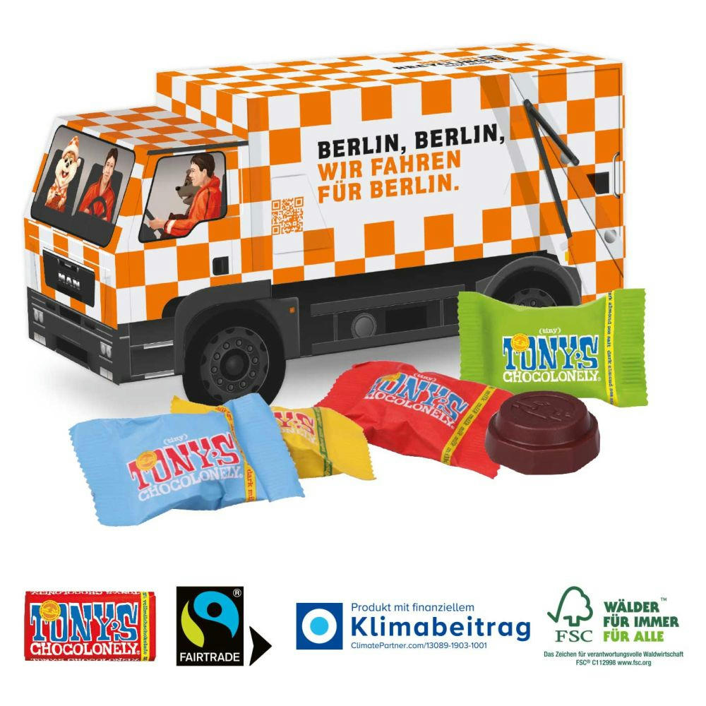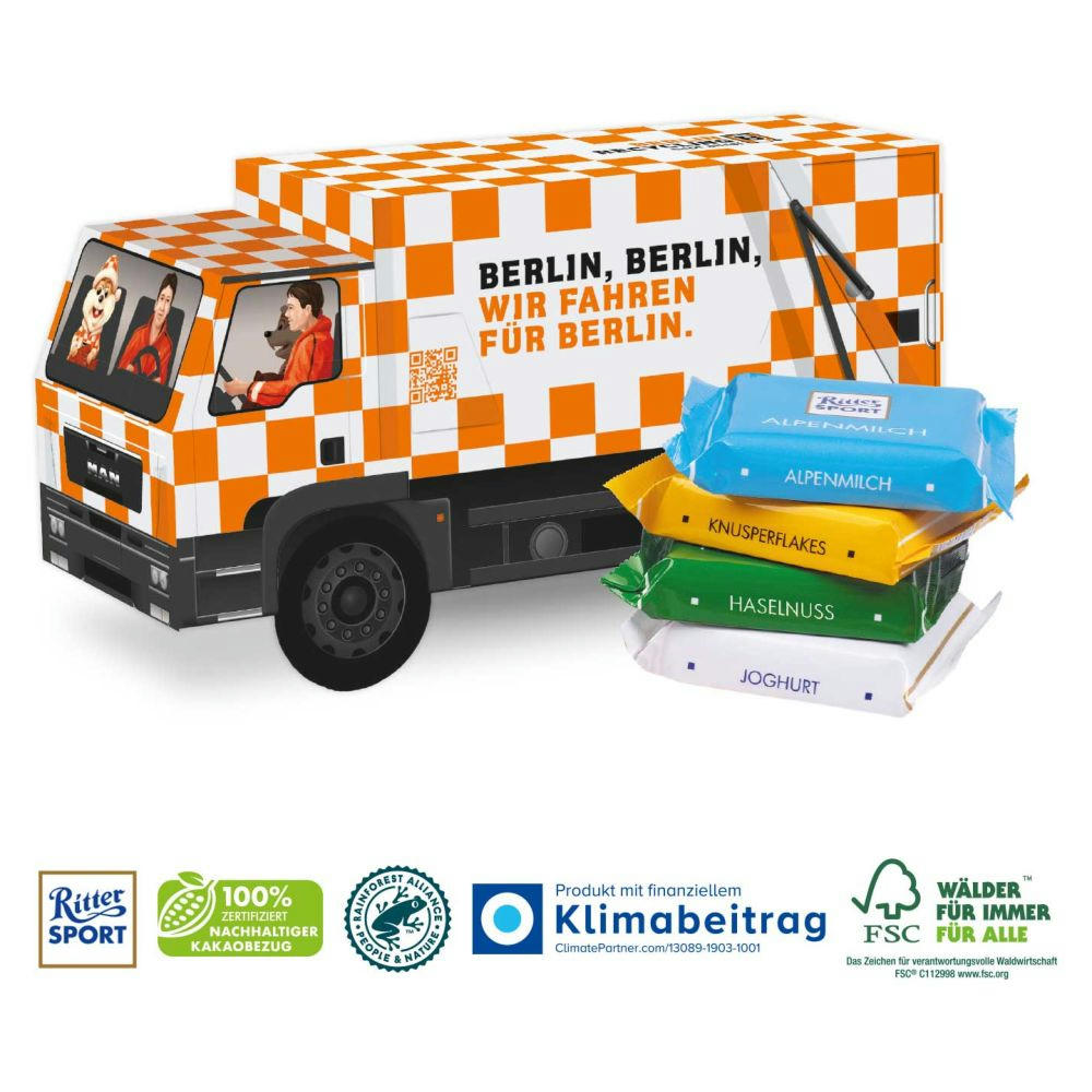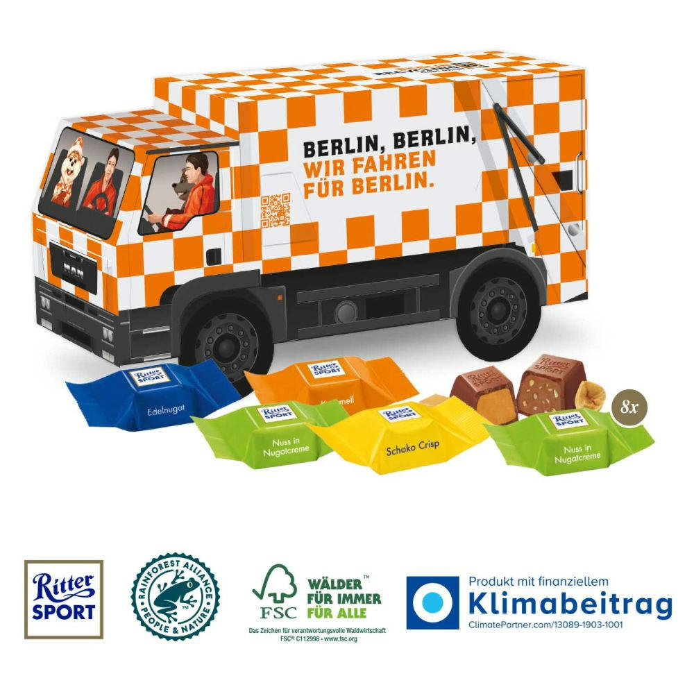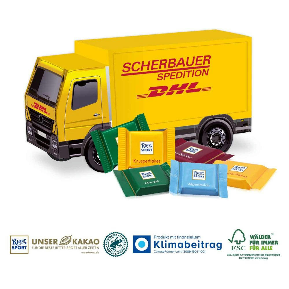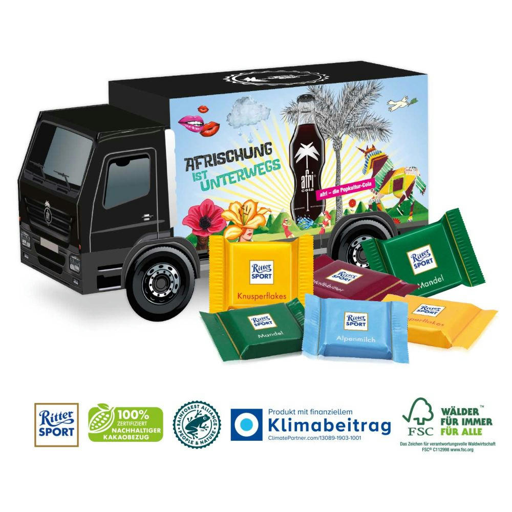 Beliebtes Firmenpräsent zum attraktiven Preis! Die beliebten 3D-Modelle „LKW“ oder „Transporter“ sind individuell in Ihrem Firmendesign bedruckbar. Eine Füllung mit feinster Markenschokolade sorgt für himmlische Genussmomente. Dieses Firmenpräsent findet bestimmt einen Ehrenplatz in den Büros Ihrer Kunden und Mitarbeiter. Produktdetails: Individuelle Präsentverpackung aus hochwertiger Kartonage mit süßer Füllung. Das Lindt & Sprüngli Farming-Programm steht für nachhaltige Kakaobohnen-Beschaffung (www.farming-program.com). // Inhalt: 12 Stück Lindt Minis (ca. 55 g) und ein zartschmelzender Lindt Weihnachtsmann (10 g). Geschmacksrichtungen bunt gemischt