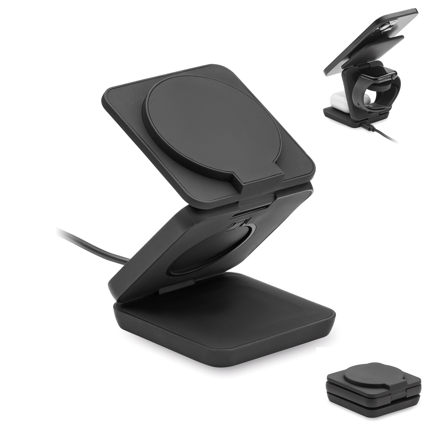 3in1 faltbare Ladestation. Gummiertes, recyceltes ABS. Inkl. kabelloses Ladegerät 15 W, Smartwatch-Ladegerät (nur Apple®) sowie TWS-Ladegerät.