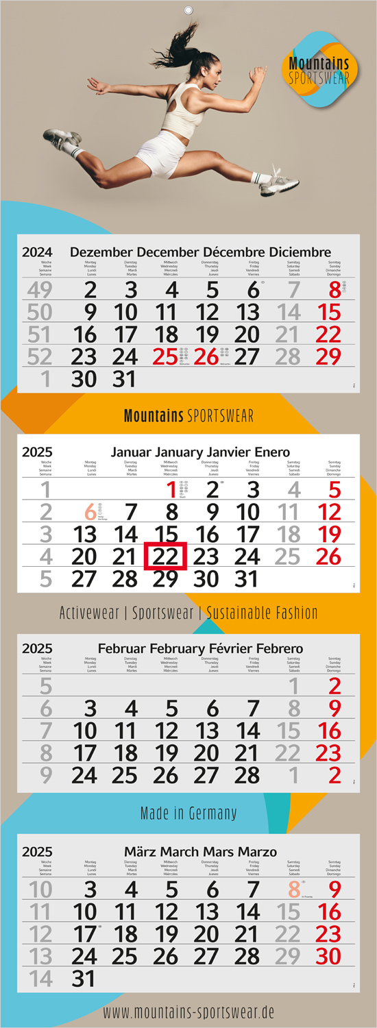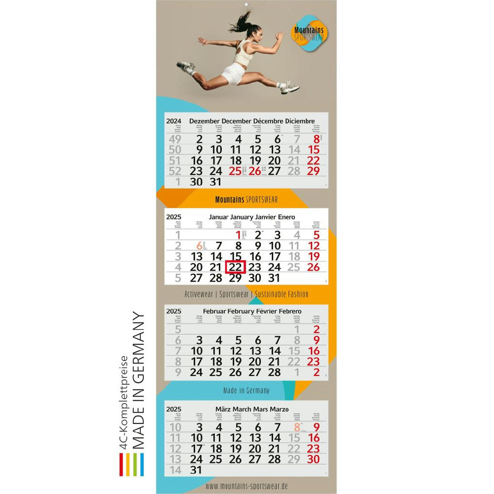 Mehrblock-Monatskalender. 4 Monate auf einen Blick. Kalendarium hellgrau/rot. Deutsch 4sprachig D/GB/F/E. Kalenderblocks einzeln perforiert. Portooptimierten zu Versänden: Rückwand gerillt zum viermaligen Falten gerillt. Aufhängöse aus Metall.