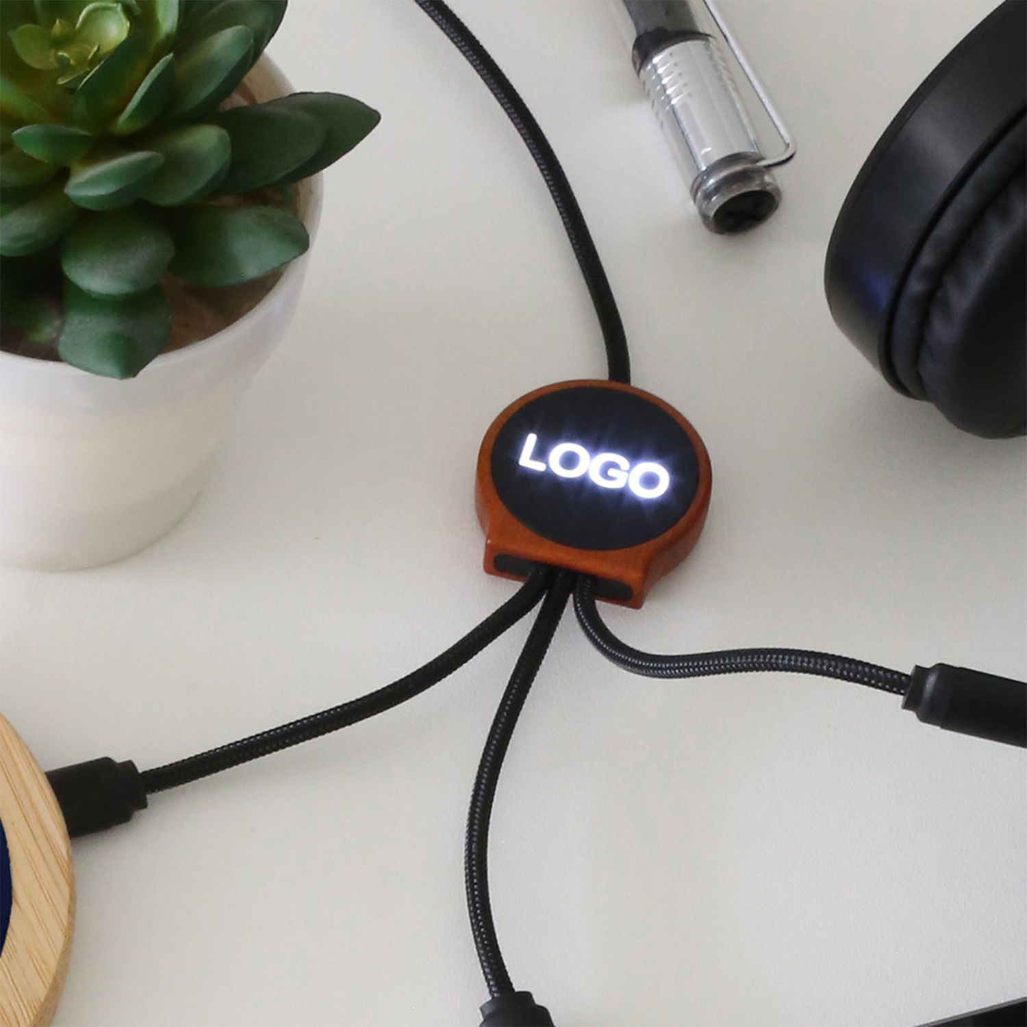 5in1 Ladekabel USB + TypC auf Micro/Lightning/TypC mit Holzgehäuse und rPET-Kabelummantelung. Mögliche Werbeanbringung Leuchtlogo weiß. Lieferung in brauner Einzelverpackung.
