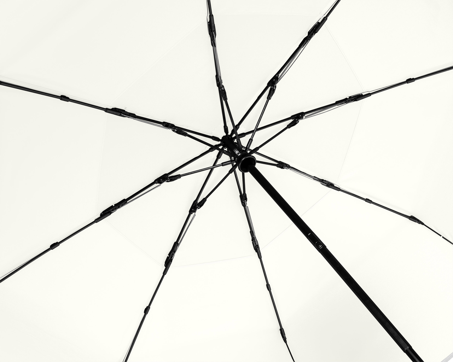 Äußerst stabiler Doppelautomatik-Gäste-Taschenschirm für zwei Personen. Komfortable Doppelautomatik-Funktion zum schnellen Öffnen und Schließen, hochwertiges Windproof-PLUS-System für eine maximale Gestell-Flexibilität bei stärkeren Windböen, flexible Fiberglasschienen, überlappender Ventilationsbezug zur Regulierung von Überdruck durch stärkere Windböen, wassersparend gefärbtes Polyester-Pongee waterSAVE® Bezugsmaterial aus recycelten Kunststoffen und mit modischer Reflexpaspel in Silber, mit waterSAVE®-Label auf dem Schließband, Griff aus recyceltem ABS mit integrierter Auslösetaste und Werbeanbringungsmöglichkeit, komfortables Futteral mit hochwertigem Zipper, gastfreundlicher großer Durchmesser