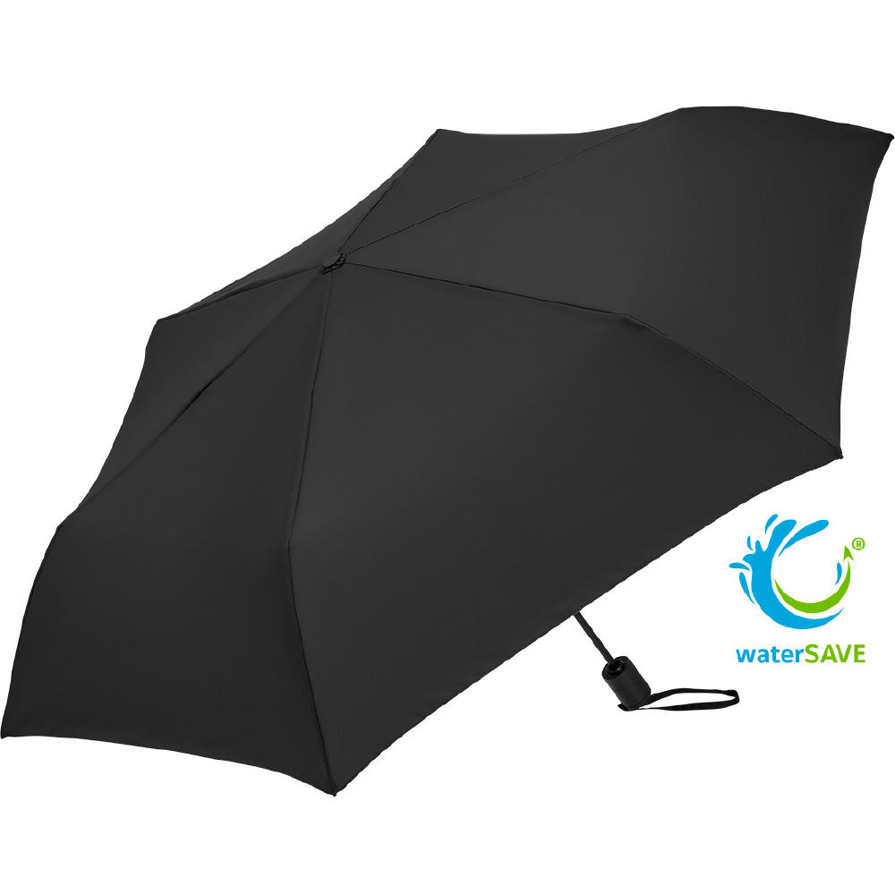 Filigraner Doppelautomatik-Taschenschirm in superleichter Ausführung. Komfortable Automatik-Funktion zum schnellen Öffnen und Schließen, hochwertiges Windproof-PLUS-System für eine maximale Gestell-Flexibilität bei stärkeren Windböen, schwarzer Aluminiumstock, wassersparend gefärbtes Polyester-Pongee waterSAVE® Bezugsmaterial aus recycelten Kunststoffen, mit waterSAVE® Label auf dem Schließband, matt-schwarzer Kunststoff-Softfeel-Griff mit Auslösetaste und Werbeanbringungsmöglichkeit, handtaschentauglich durch superleichtes Gewicht und kompakte Größe