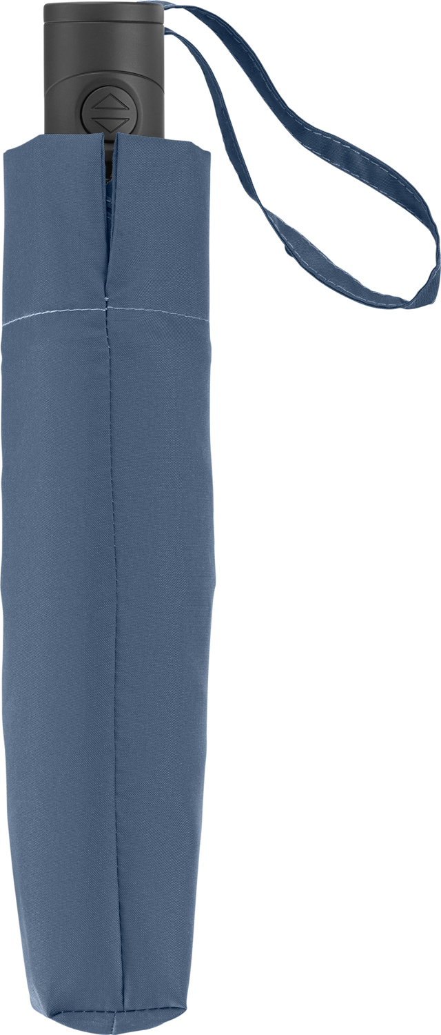 Filigraner Doppelautomatik-Taschenschirm in superleichter Ausführung. Komfortable Automatik-Funktion zum schnellen Öffnen und Schließen, hochwertiges Windproof-PLUS-System für eine maximale Gestell-Flexibilität bei stärkeren Windböen, schwarzer Aluminiumstock, wassersparend gefärbtes Polyester-Pongee waterSAVE® Bezugsmaterial aus recycelten Kunststoffen, mit waterSAVE® Label auf dem Schließband, matt-schwarzer Kunststoff-Softfeel-Griff mit Auslösetaste und Werbeanbringungsmöglichkeit, handtaschentauglich durch superleichtes Gewicht und kompakte Größe