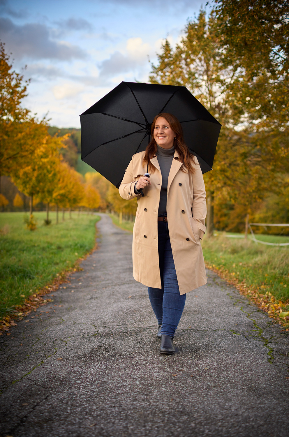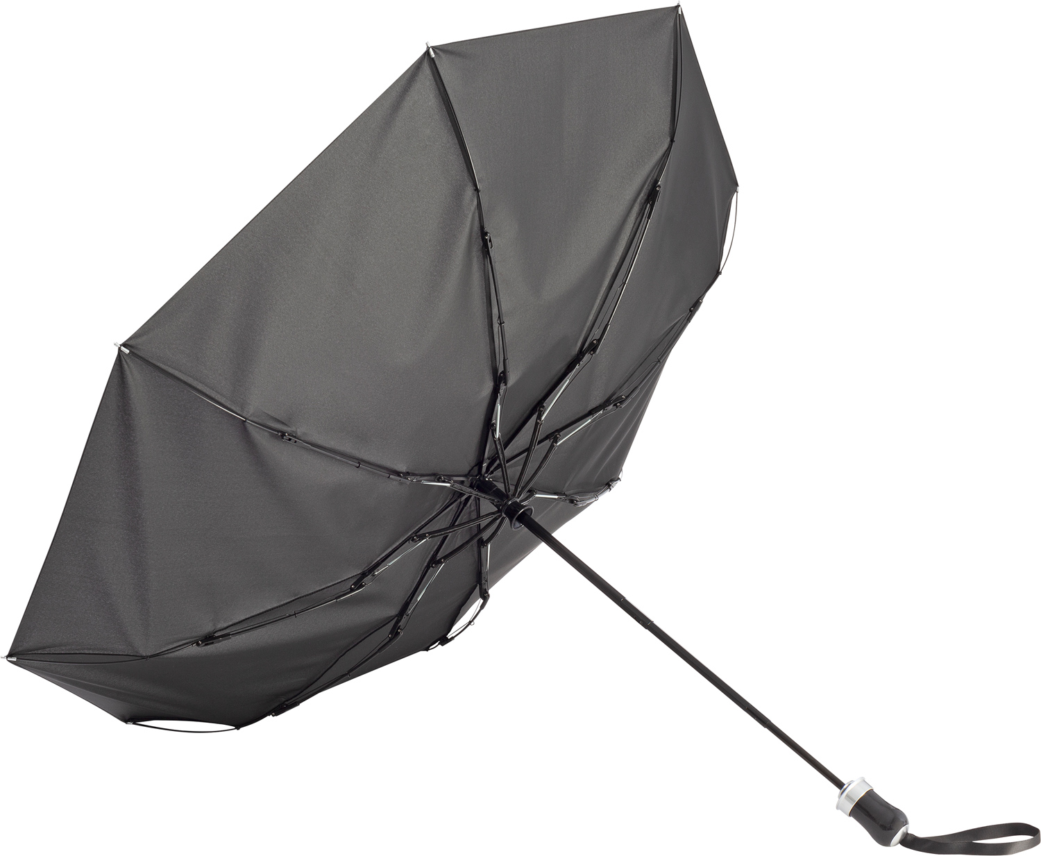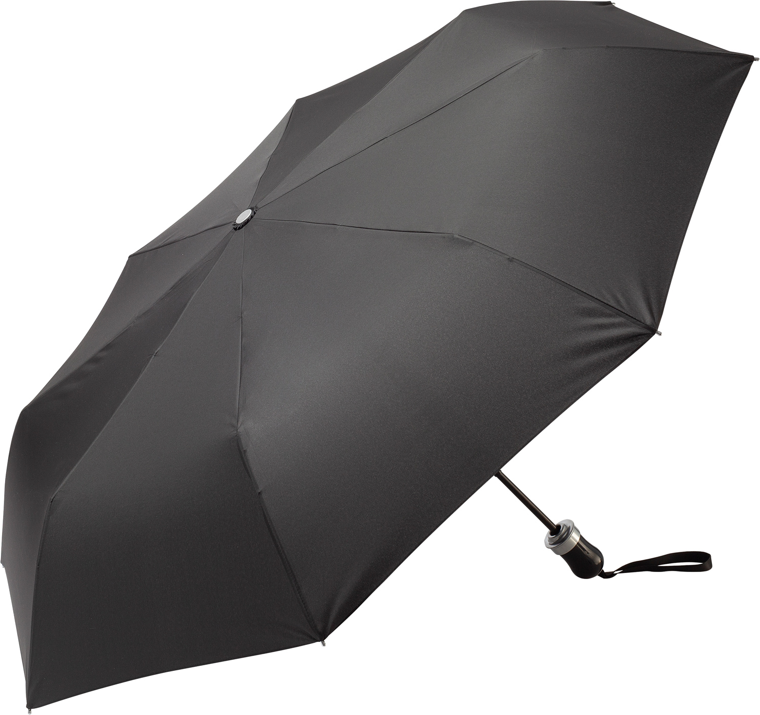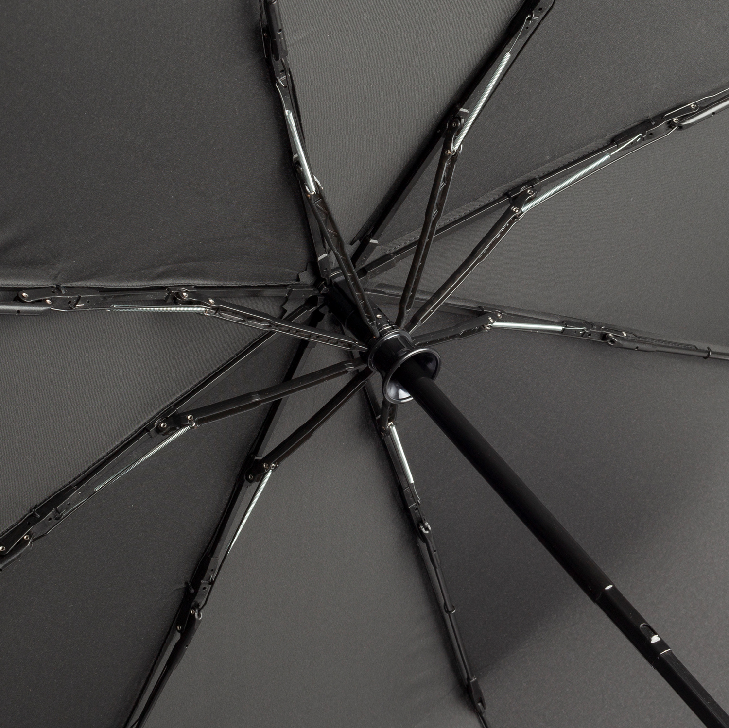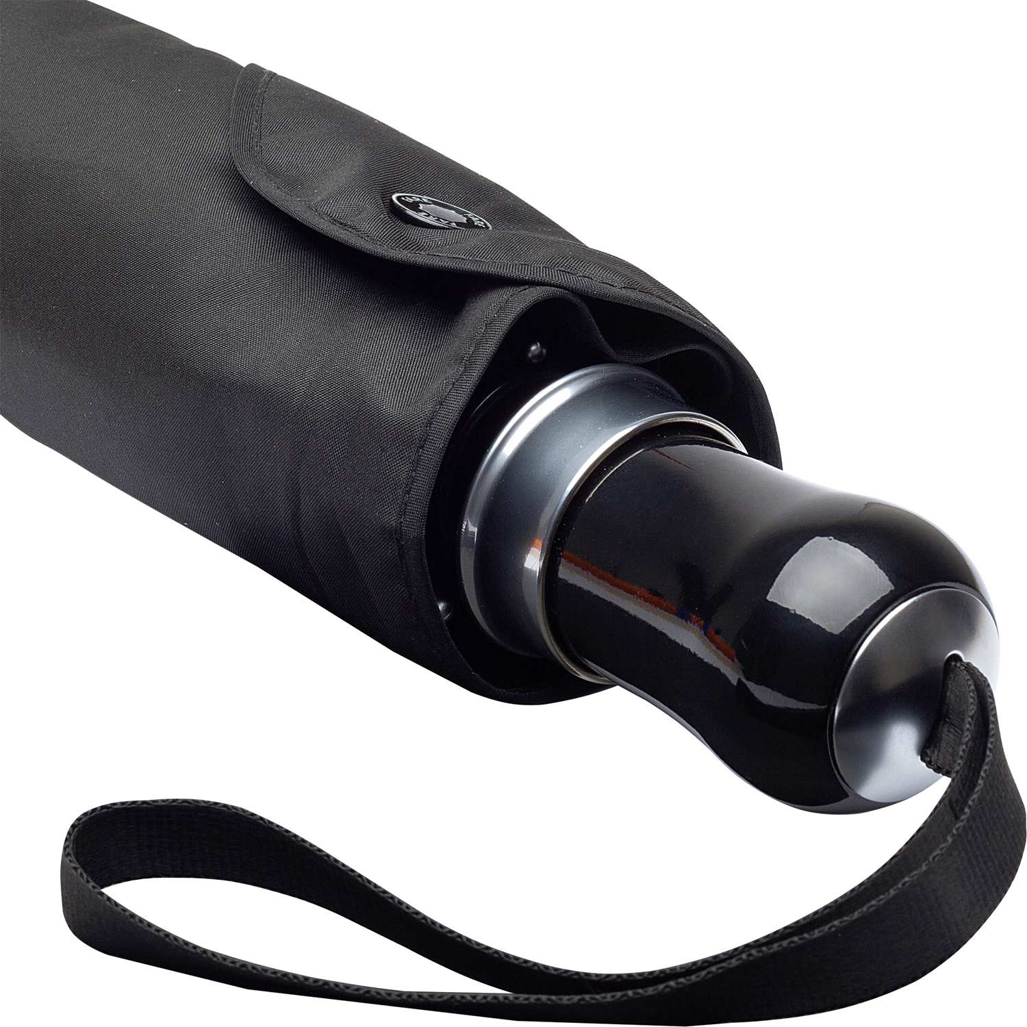 Schicker Taschenschirm mit neuartigem Öffnungs- und Schließmechanismus. Komfortable Doppelautomatik-Funktion zum schnellen Öffnen und Schließen durch Herunterziehen des Rings, hochwertiges Windproof-System für eine maximale Gestell-Flexibilität bei stärkeren Windböen, wassersparend gefärbtes Polyester-Pongee waterSAVE® Bezugsmaterial aus recycelten Kunststoffen, mit waterSAVE®-Label auf dem Schließband, silberne Nickelspitzen, Griff hochglänzend schwarz mit verchromten Applikationen und gewebter Trageschlaufe, Schließband und Futteral mit edlem Druckknopf.