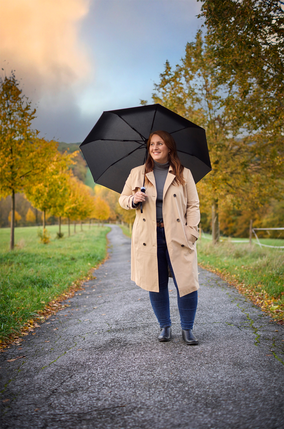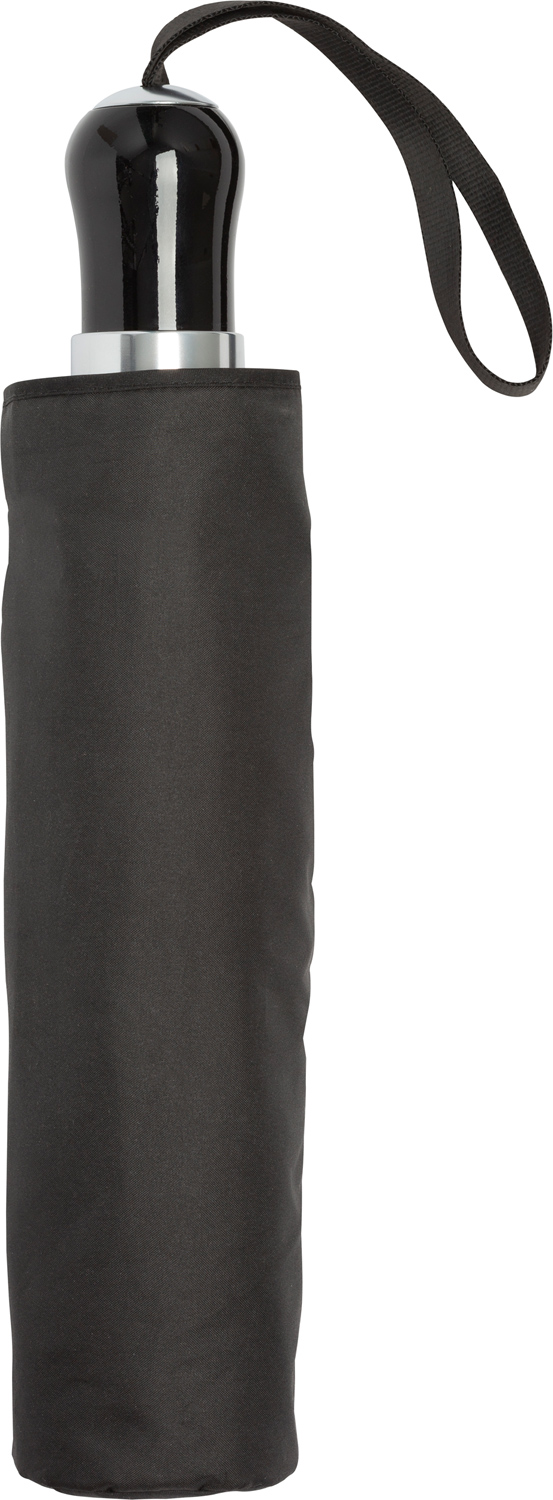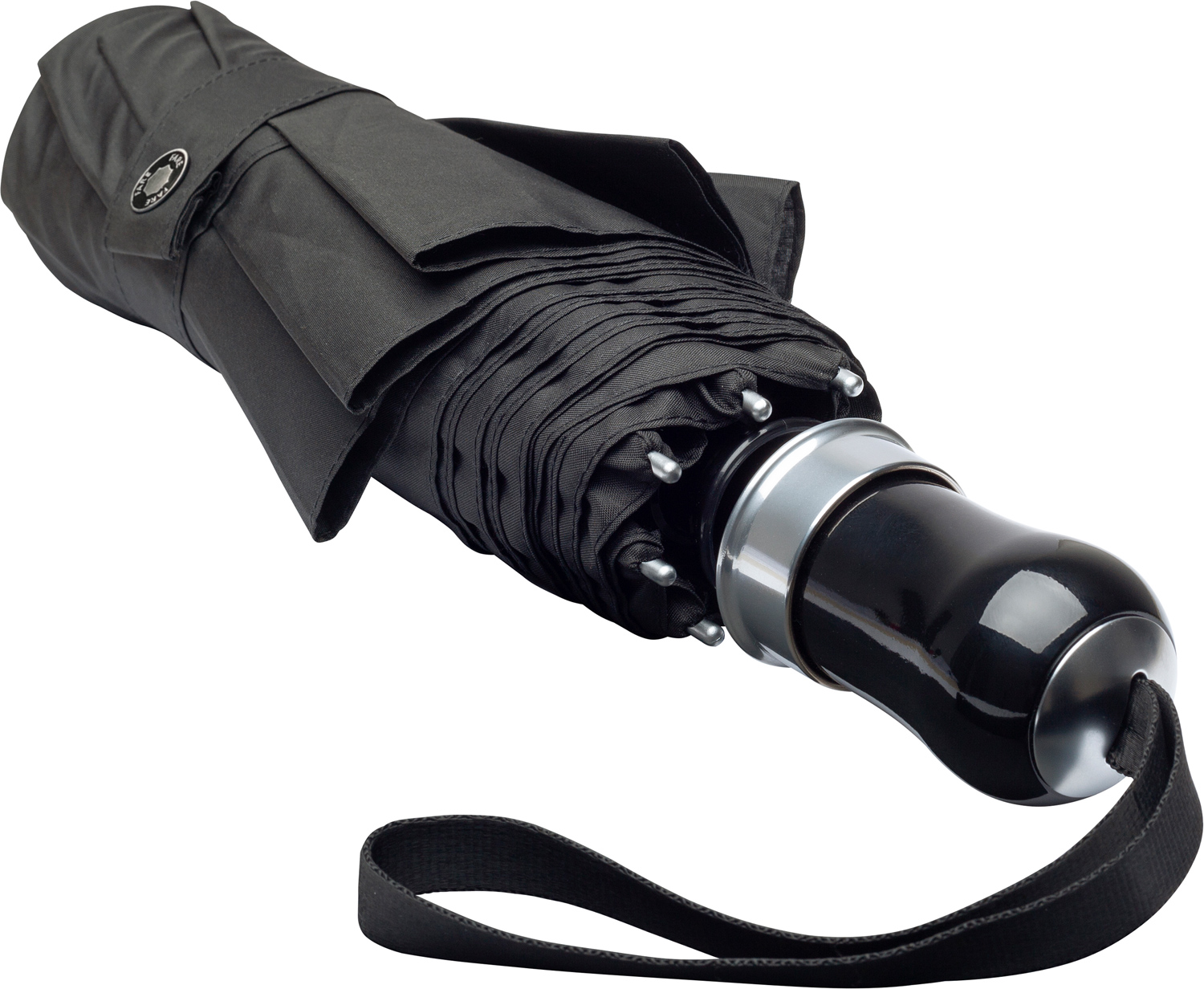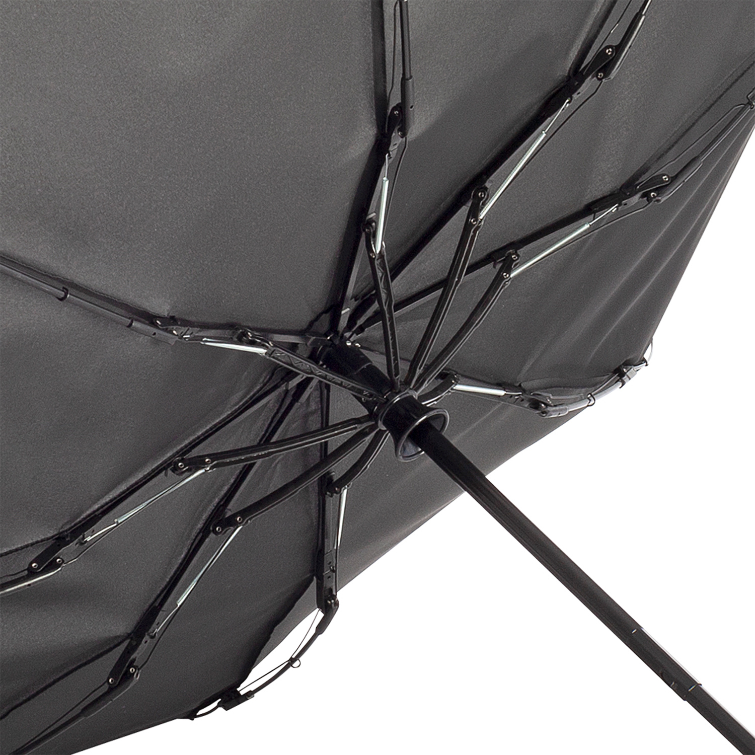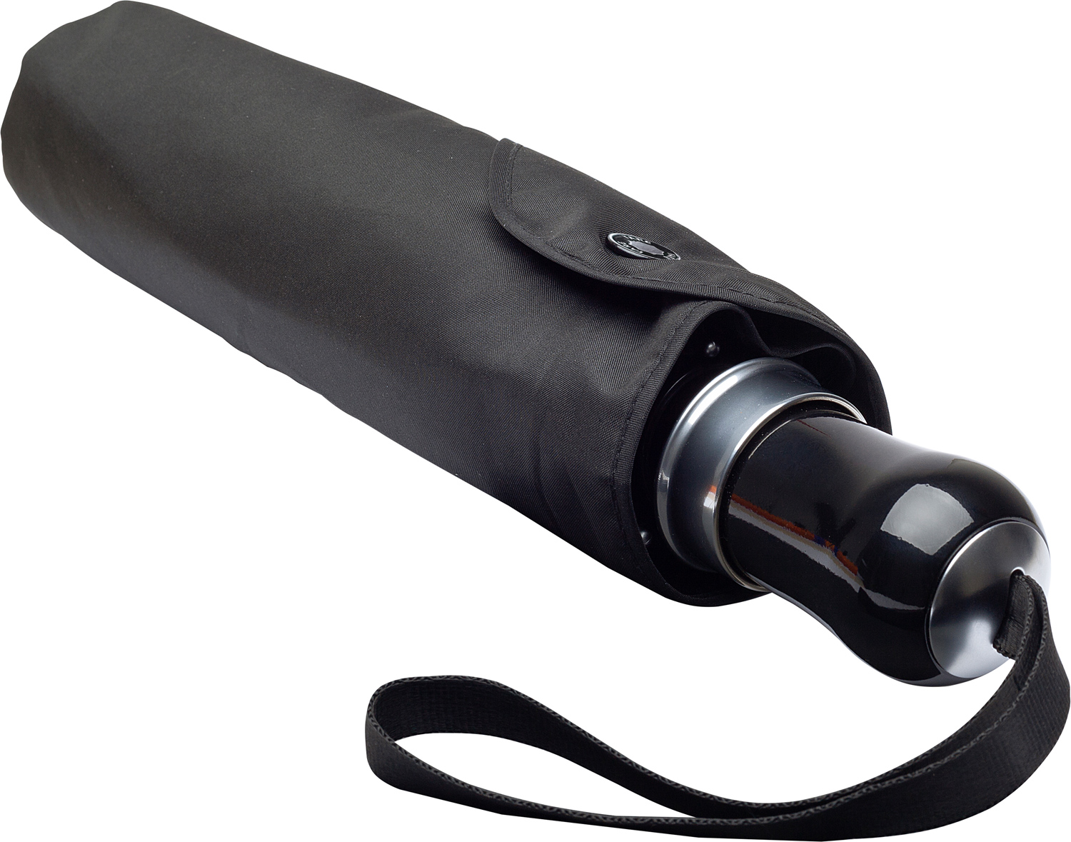 Schicker Taschenschirm mit neuartigem Öffnungs- und Schließmechanismus. Komfortable Doppelautomatik-Funktion zum schnellen Öffnen und Schließen durch Herunterziehen des Rings, hochwertiges Windproof-System für eine maximale Gestell-Flexibilität bei stärkeren Windböen, wassersparend gefärbtes Polyester-Pongee waterSAVE® Bezugsmaterial aus recycelten Kunststoffen, mit waterSAVE®-Label auf dem Schließband, silberne Nickelspitzen, Griff hochglänzend schwarz mit verchromten Applikationen und gewebter Trageschlaufe, Schließband und Futteral mit edlem Druckknopf.