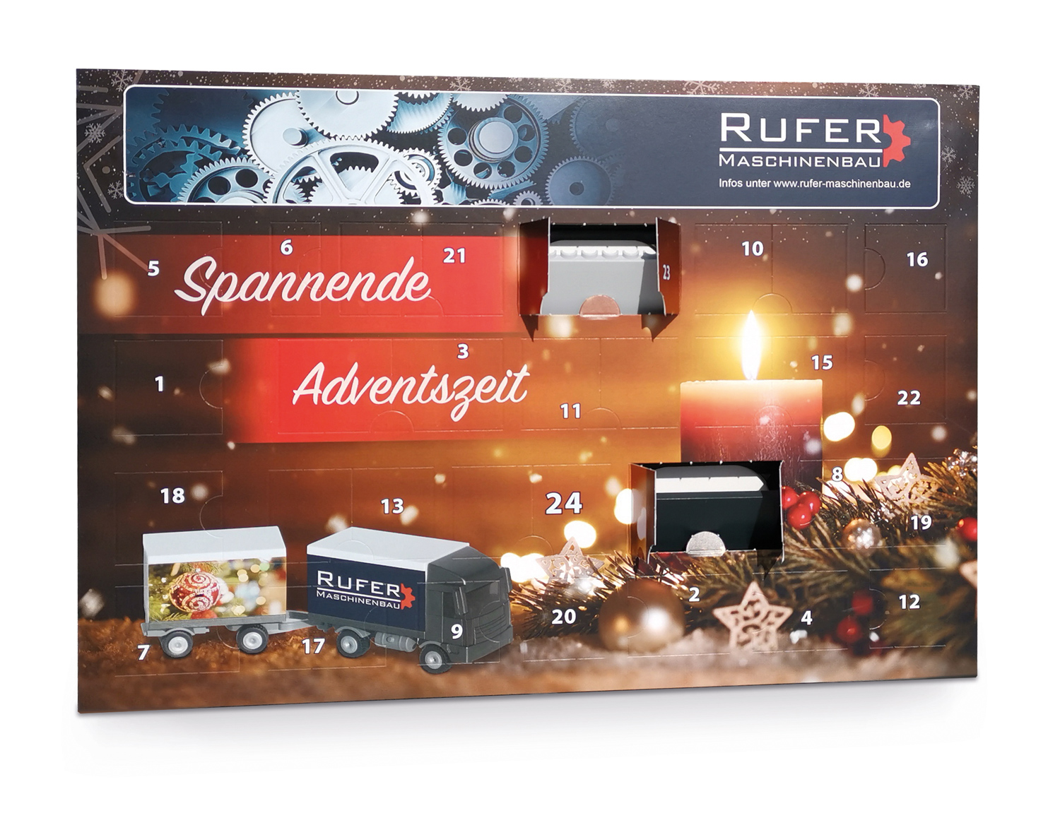 Ein Adventskalender-Bausatz bestehend aus 37 Teilen. Made in Germany. Hinter jedem der 24 Fenster befinden sich Teile, die Stück für Stück einen modernen LKW mit Anhänger entstehen lassen. Preis inkl. 4c-Druck auf der Adventskalendervorderseite (optional Druck auf LKW-Seitenteilen gegen Aufpreis).