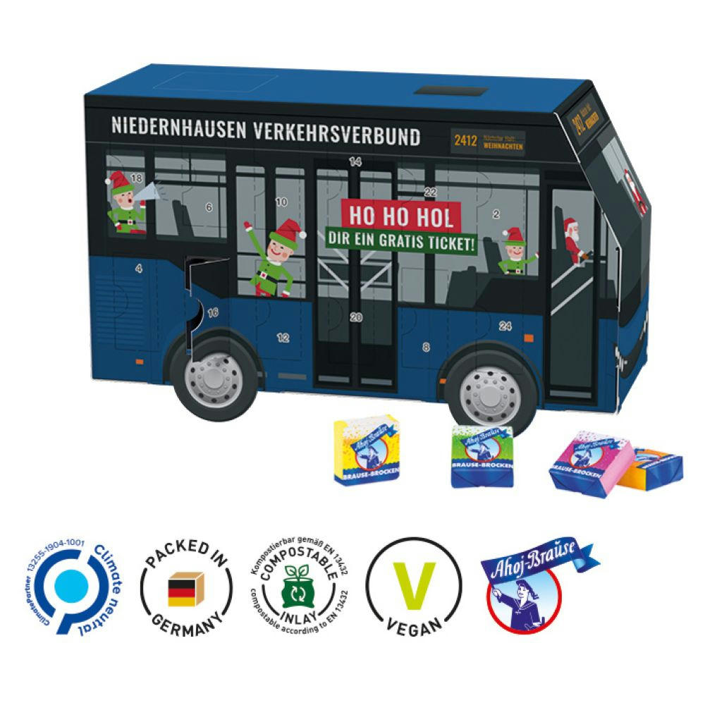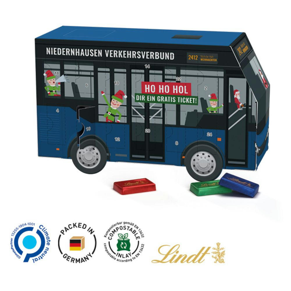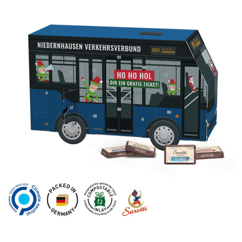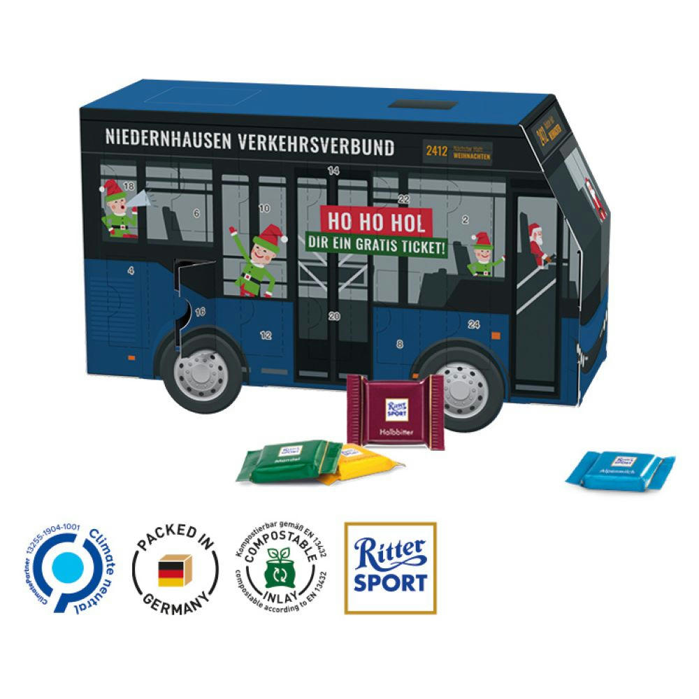 Adventskalender Bus in Vollkartonhülle mit kompostierbarem Inlay, rundum individuell bedruckt. Inhalt: 24 Ritter SPORT Schokowürfel, variierende Mischung aus den Sorten : Schoko Crisp, Mousse au Chocolat, Vollnuss in Nugatcreme, Karamell Duo, 192 g.