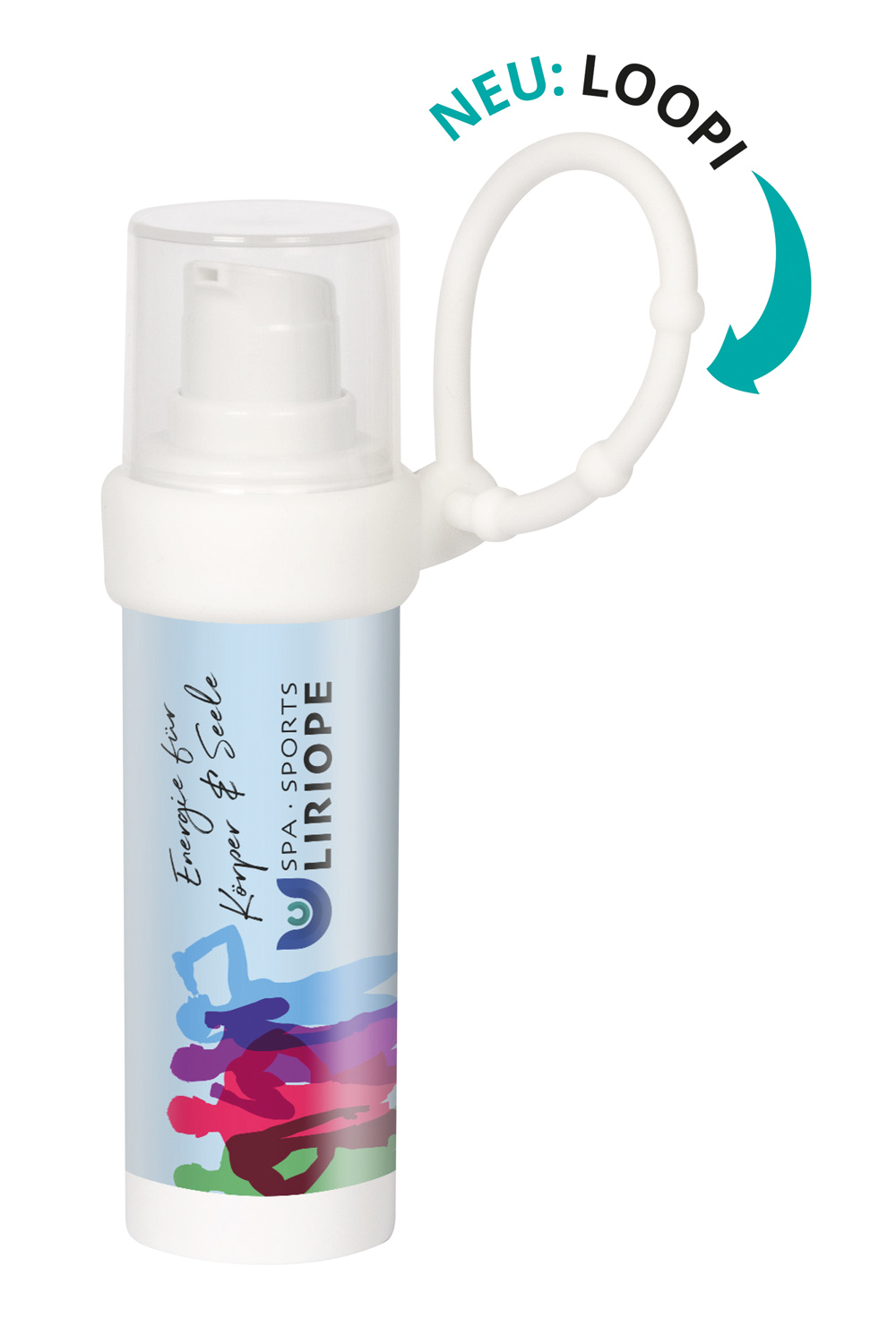 30 ml Handcreme-Spender mit Airless-Technologie. Gegen Aufpreis auch mit zusätzlicher Silikonhalterung "Loopi" erhältlich. Erhältlich mit verschiedenen Füllungen: * Aloe Vera Handcreme * Hyaluron Pflegegel * Sonnenschutzcreme Sensitiv LSF 50 * Made in Germany