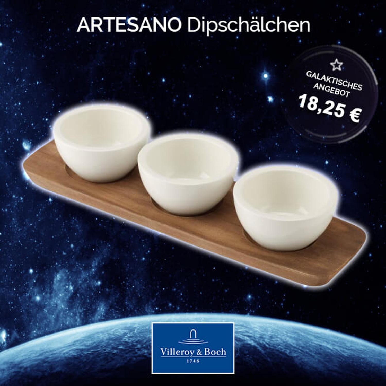 * Lieferumfang: 3 x Villeroy & Boch Artesano Original Dipschälchen, 1 x Servierplatte aus Holz