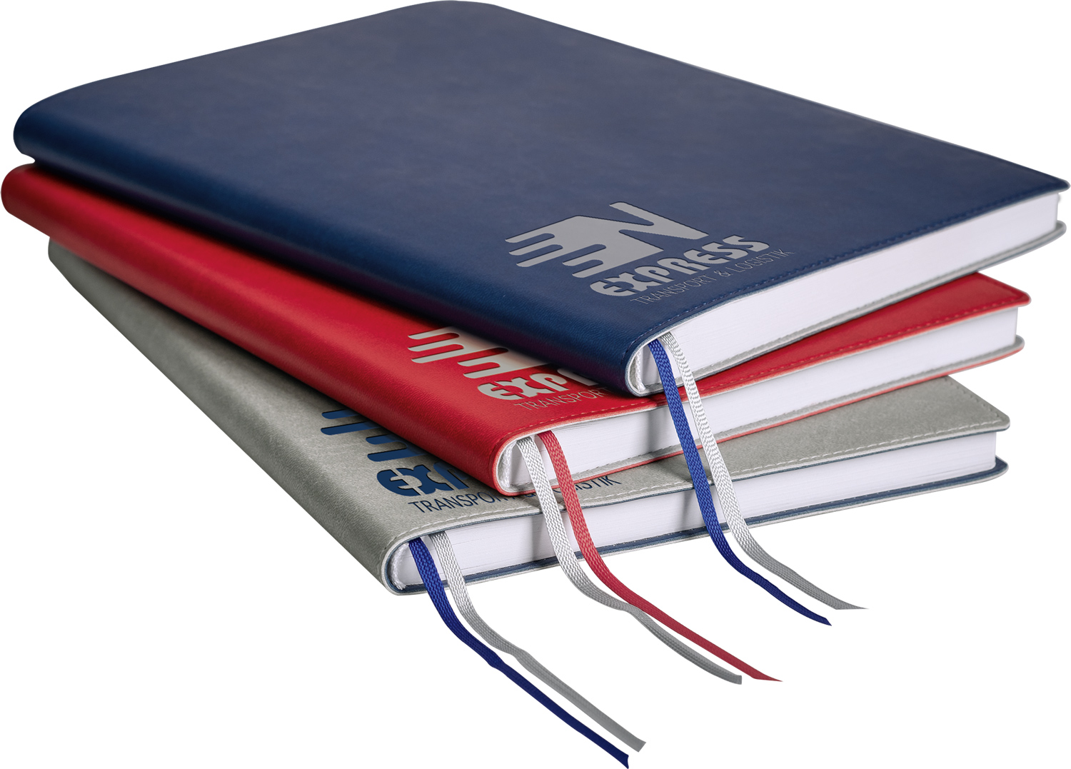 Notizbuch mit flexiblem Softeinband als Duodecke in 3 Farben, 192 Seiten karierter Inhalt mit Umrandung und Kopfzeile und Perforation, aus Recyclingpapier, Kapitalband, umlaufende Ziersteppnaht und zwei Zeichenbänder, runde Ecken bei Inhalt und Einband.