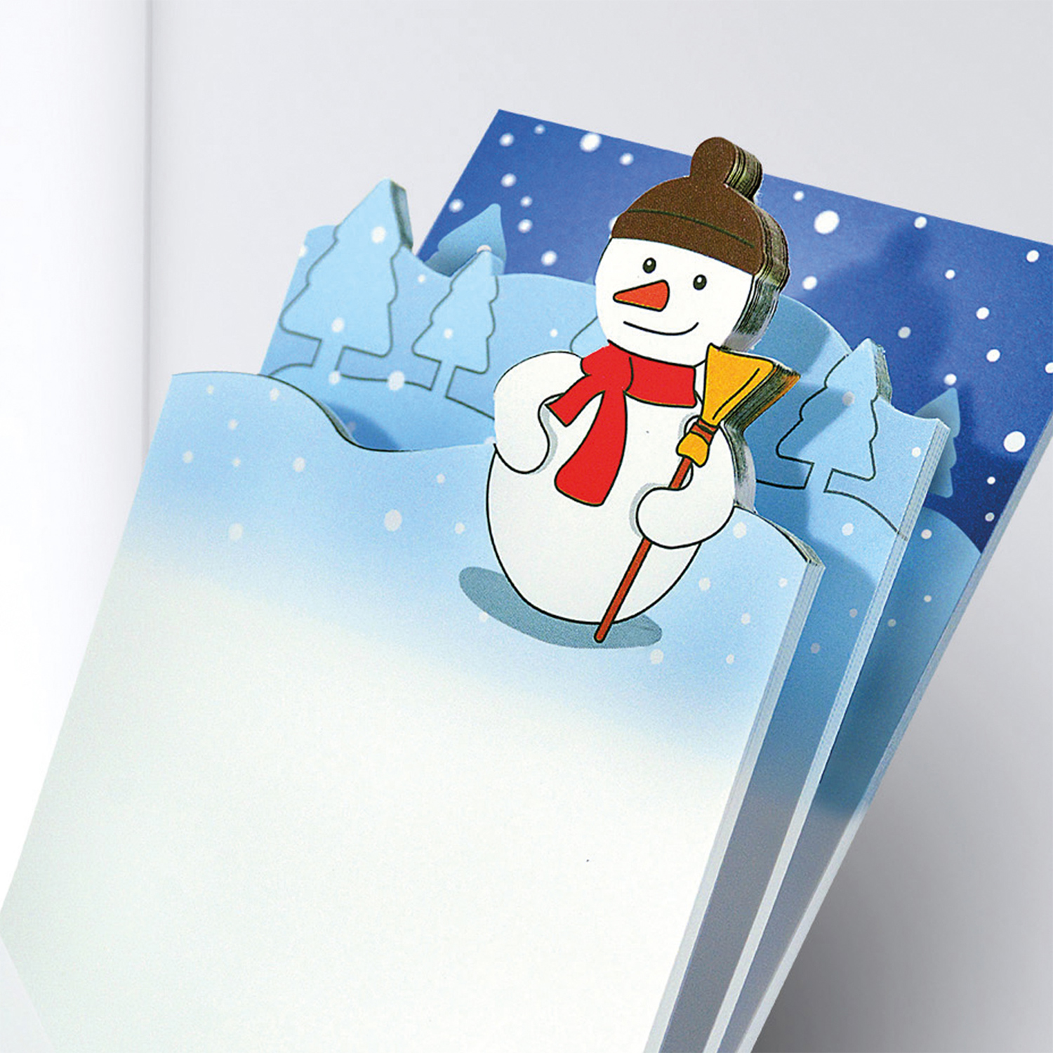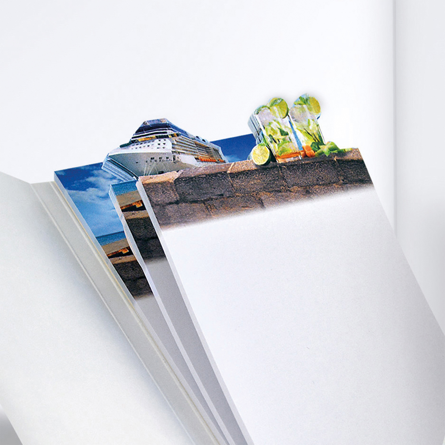 Durch die Formstanzung des mittleren und des obersten Blocks und das perfekt aufeinander abgestimmte Druckmotiv ergibt sich ein beeindruckender 3D-Effekt. Material Block: Offsetpapier 90 g / m2 matt, holzfrei, weiß. Material Bodenblatt: 300 g / m2 Offsetkarton, weiß. Farbe: projektabhängig. Maße: 8,5 x 16 cm à ca. 60 Blatt.