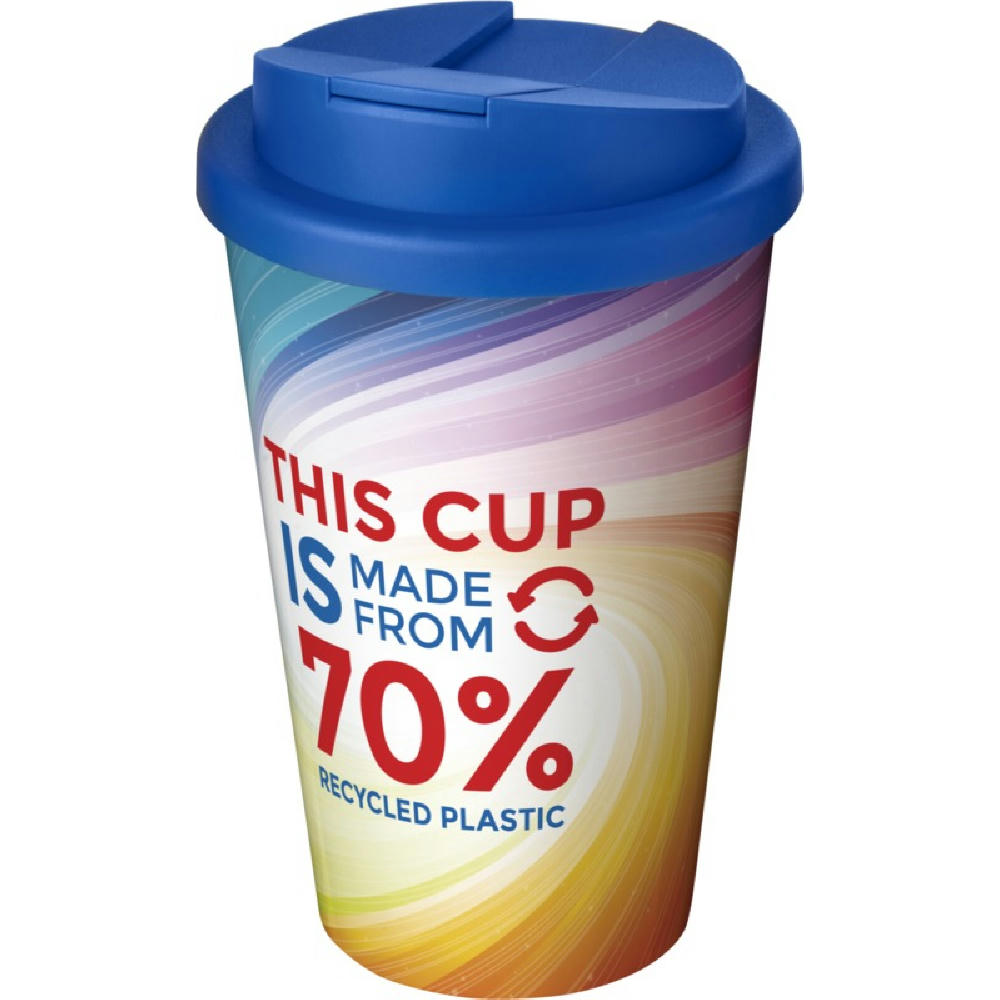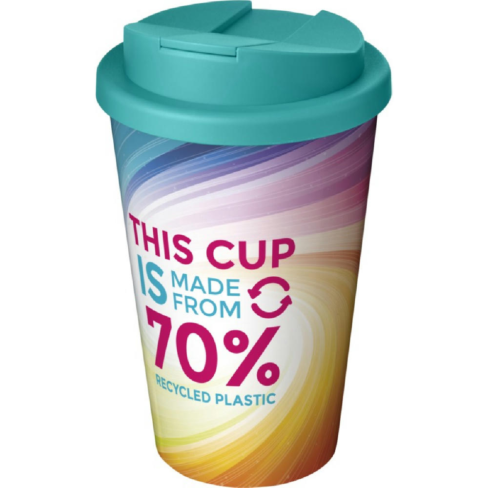 Doppelwandiger Isolierbecher mit drehbarem, auslaufsicherem Deckel und einem vollfarbigen Rundum-Design. Hergestellt aus insgesamt 70 % recyceltem Material (recycelter Becher und schwarze Innenschicht) und mit einem Standard-PP-Deckel. Der Becher ist vollständig recycelbar, spülmaschinenfest und mikrowellengeeignet. 350 ml Fassungsvermögen und BPA-frei. Verpackt in einem kompostierbaren Beutel. Hergestellt in UK.