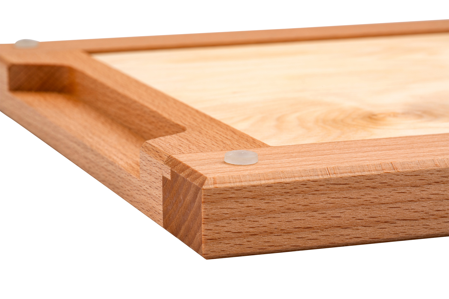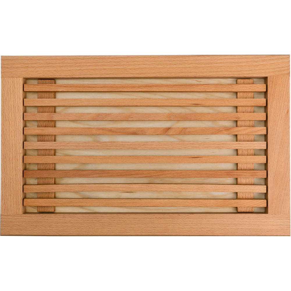 Brotschneidebrett aus geöltem Buchenholz mit herausnehmbarem Krümelgitter und Gummifüßen als Schutz gegen Verrutschen.