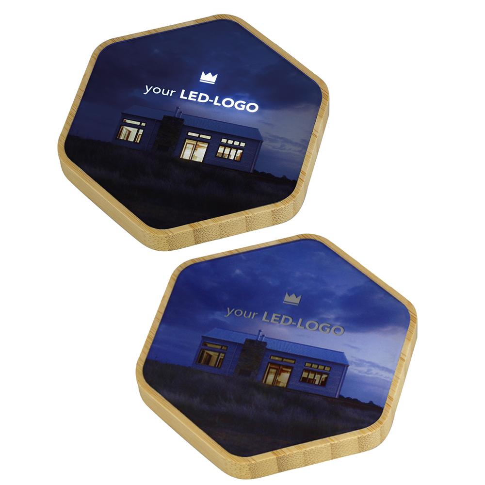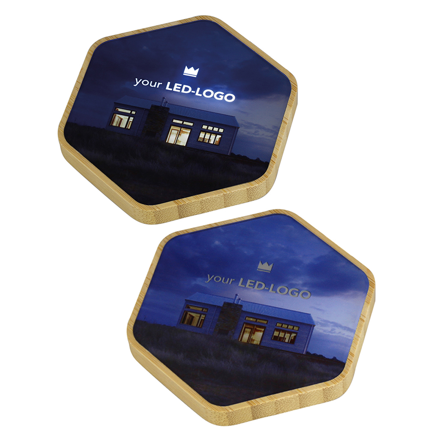 10 Watt Sechseckiger Bambus Wireless Charger inklusive Leuchtmotiv. Lieferung in brauner Einzelverpackung.