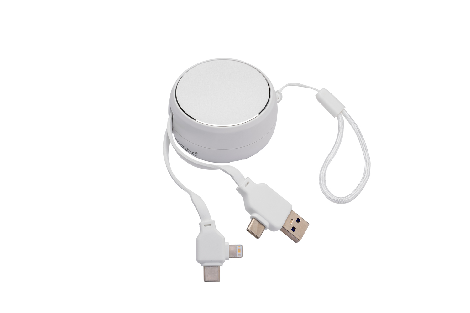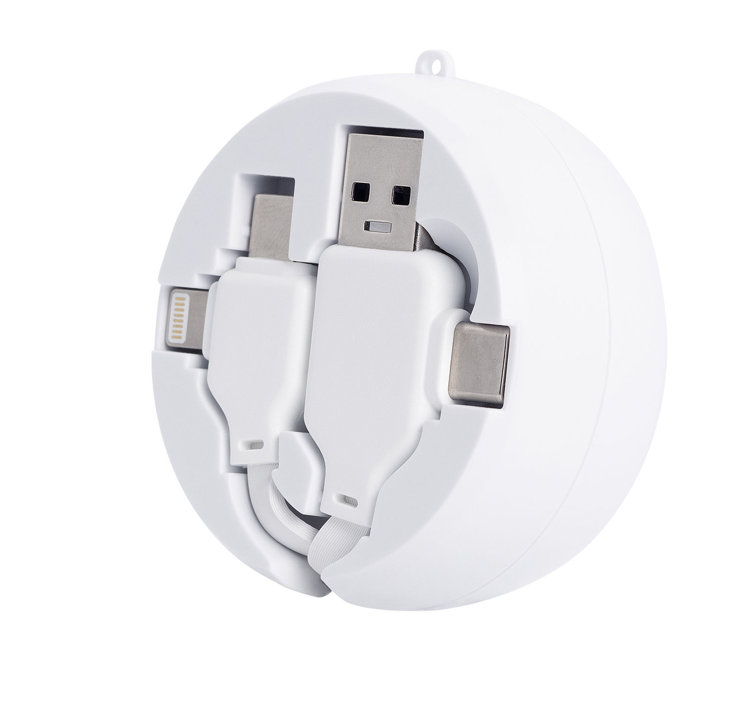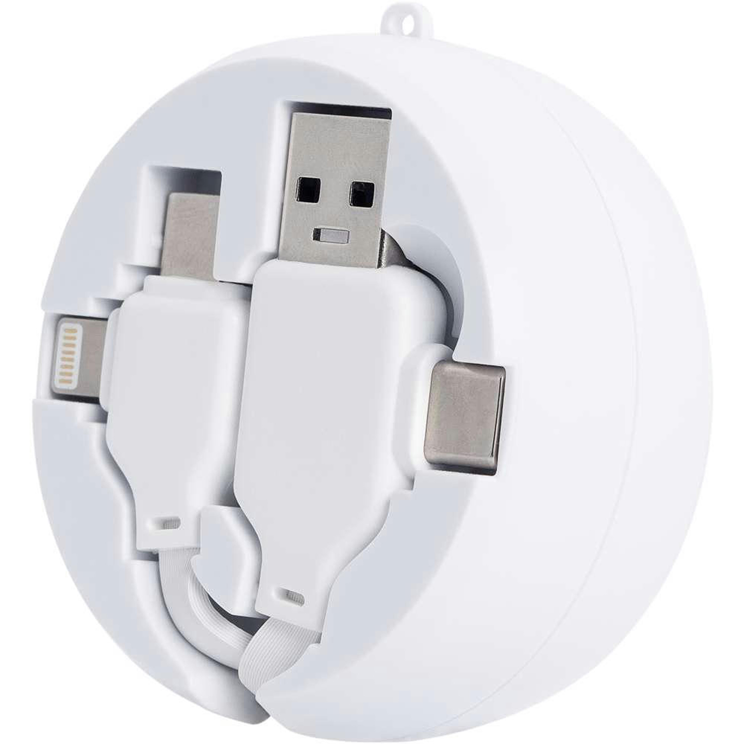 Sieht gut aus und darf in keiner Tasche fehlen! - Kabeltrommel mit allen wichtigen Anschlüssen (USB-A, Typ-C und Lightning), - Laden mit bis zu 65W, Datenübertragung bis zu 480Mbps. - Kabellänge ausgezogen 94 cm. - Mit praktischer Trageschlaufe. - Material: ABS, Aluminium - Verpackung: plastikfreie Einzelverpackung - Maße: 58 x 60 x 27 mm - Gewicht: 53 g - - Werbeanbringung: - Auf dem Körper 30 x 30 mm (D2, L2, UV2); - - Dieses Produkt unterstützt aktiv den Ausgleich der entstehenden CO2-Emissionen durch zertifizierte Klimaschutzprojekte. -