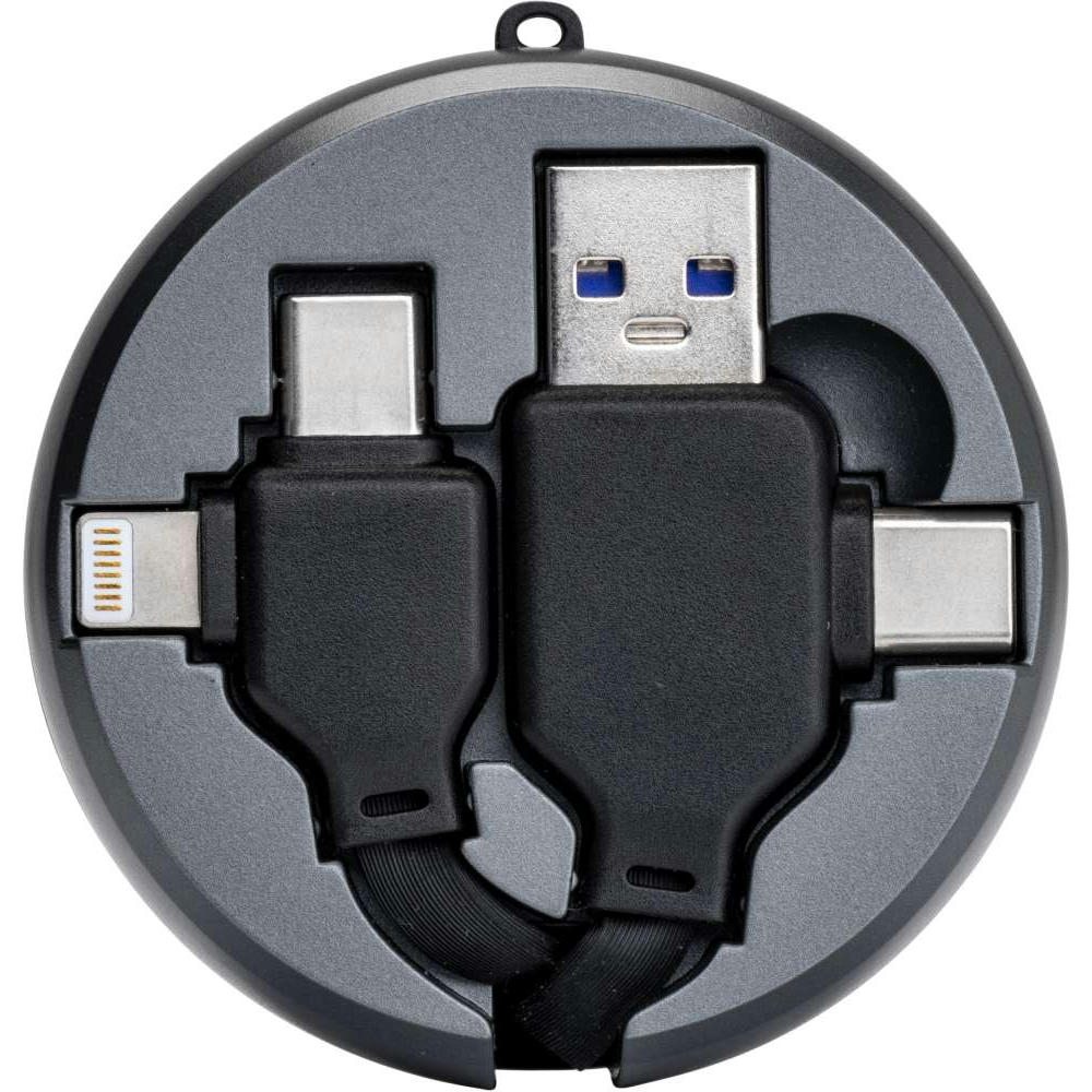 Mit allen wichtigen Anschlüssen: - USB-A, USB-C und Lightning - Kapazität 65W (max.) - Datenübertragung bis zu 480mbps - Kabellänge ausgezogen 94 cm - Mit Trageschlaufe - Material: ABS, Aluminium - Maße: 58 x 60 x 27 mm - Gewicht: 53 g - - Werbeanbringung: - Auf dem Körper 30 x 30 mm (D2, L2, UV2); - - Dieses Produkt unterstützt aktiv den Ausgleich der - Entstehenden CO2-Emissionen durch zertifizierte - Klimaschutzprojekte.