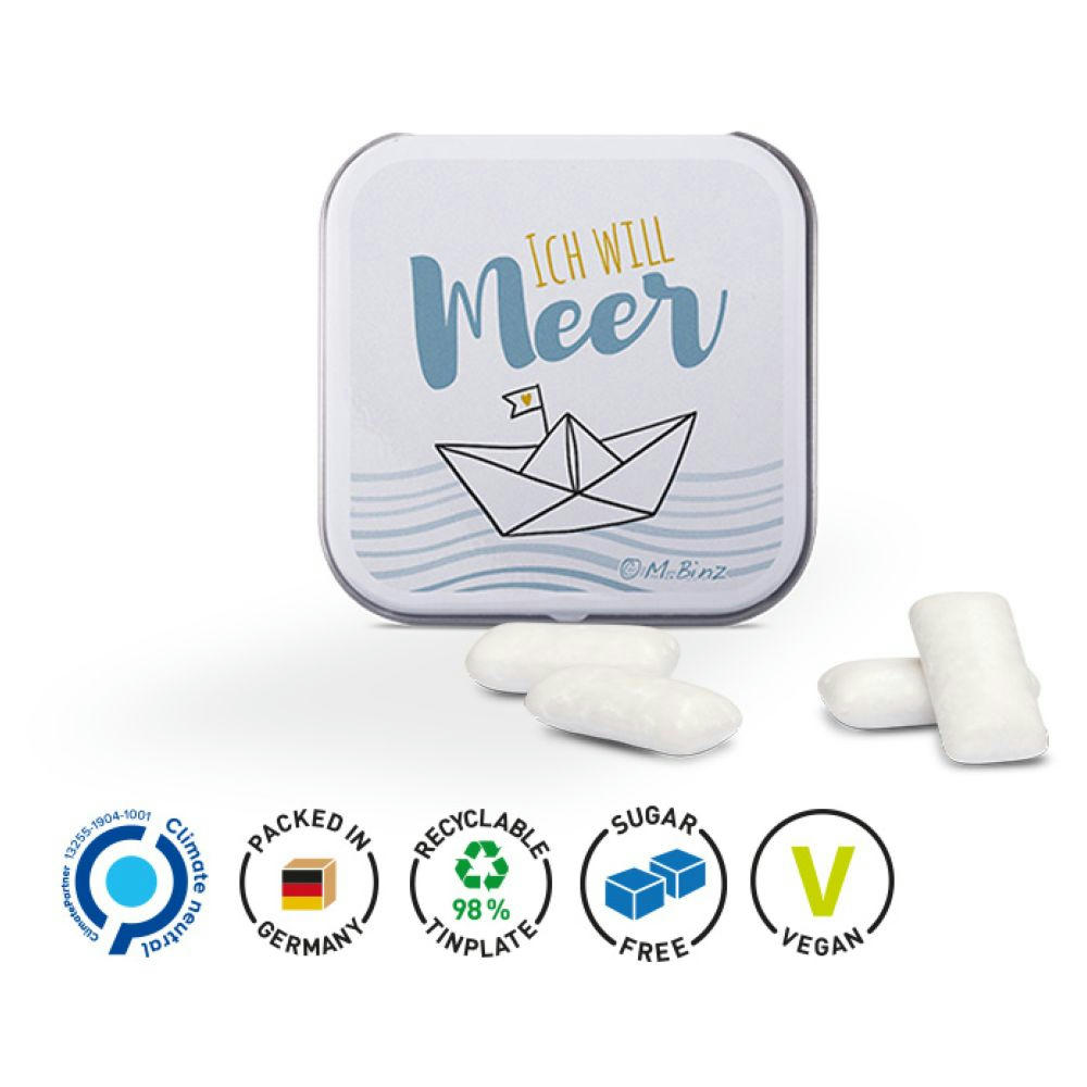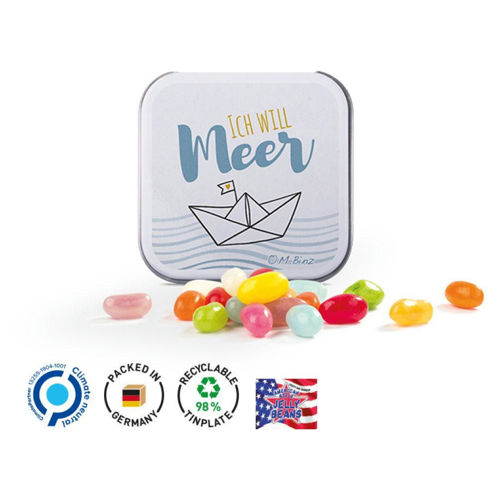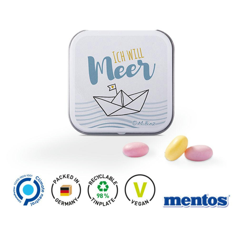 Quadratische weiße Metalldose mit Scharnierdeckel, Weißblech 98% recycelbar, individuell bedruckt. Inhalt: Cavendish & Harvey Mini Bonbons Japanisch Minze, 20 g.