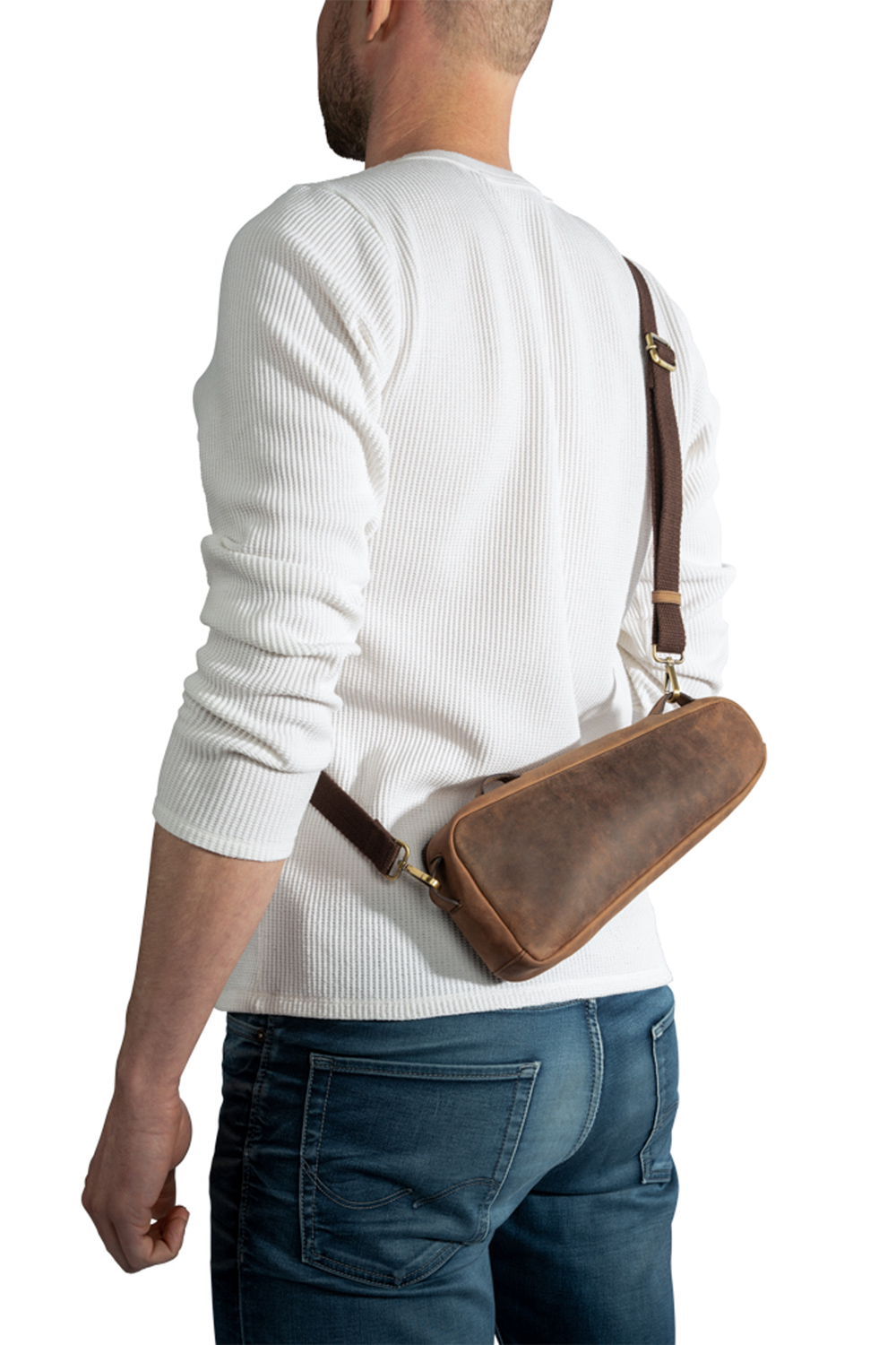 Abnehmbar, mit RV, mit drei abnehmbaren Schlaufen, einem langen abnehm- und verstellbarem Riemen, innen: 1 Steckfach
