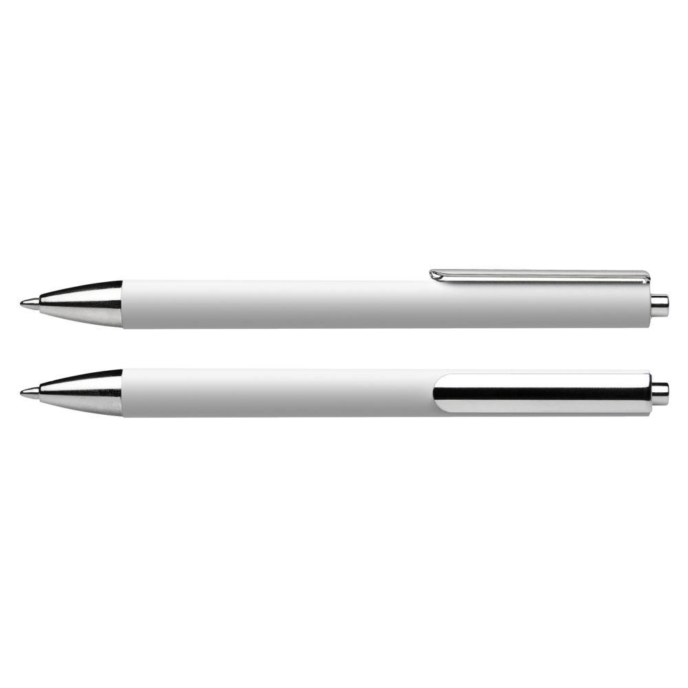 Druckkugelschreiber aus transparentem oder opakem Kunststoff. Oberteil mit mattierter Soft-Touch-Lackierung. Gehäusespitze, Clip und Druckknopf aus Metall. Ausgestattet mit Schneider-Mine 774 M. Produkt mit finanziellem Klimabeitrag: Kompensation in Höhe der unvermeidbaren Emissionen in ein zertifiziertes Klimaschutzprojekt. Gehäuse: weiß. Schreibfarbe: blau.
