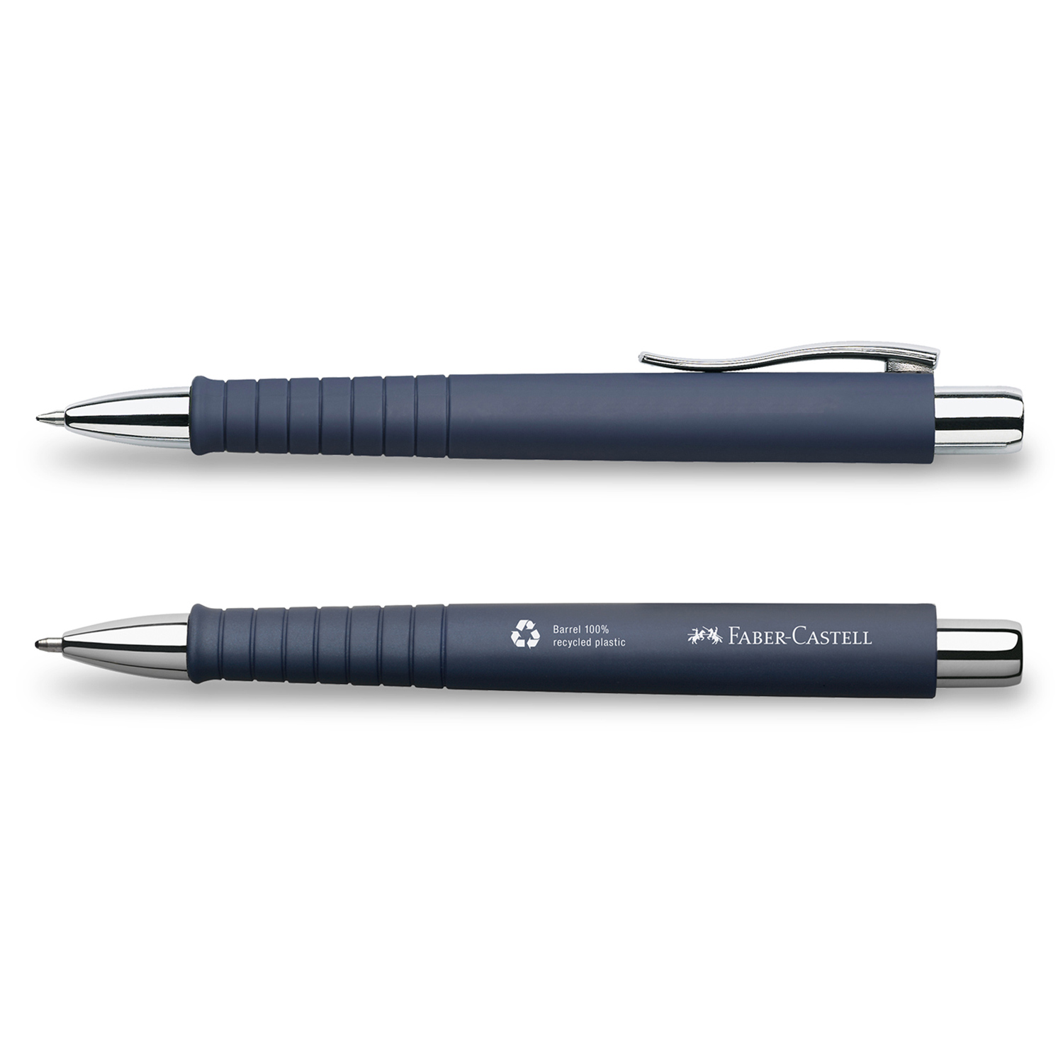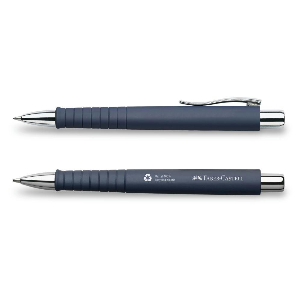 Kugelschreiber mit Schaft aus recyceltem Kunststoff in ergonomischer Dreikantform mit Soft-Touch Oberfläche, verchromter Kunststoffclip. Metallgroßraummine blau / XB, dokumentecht. Preis inkl. 1c-Druck. Farbe: dunkelblau, weiß, schwarz.