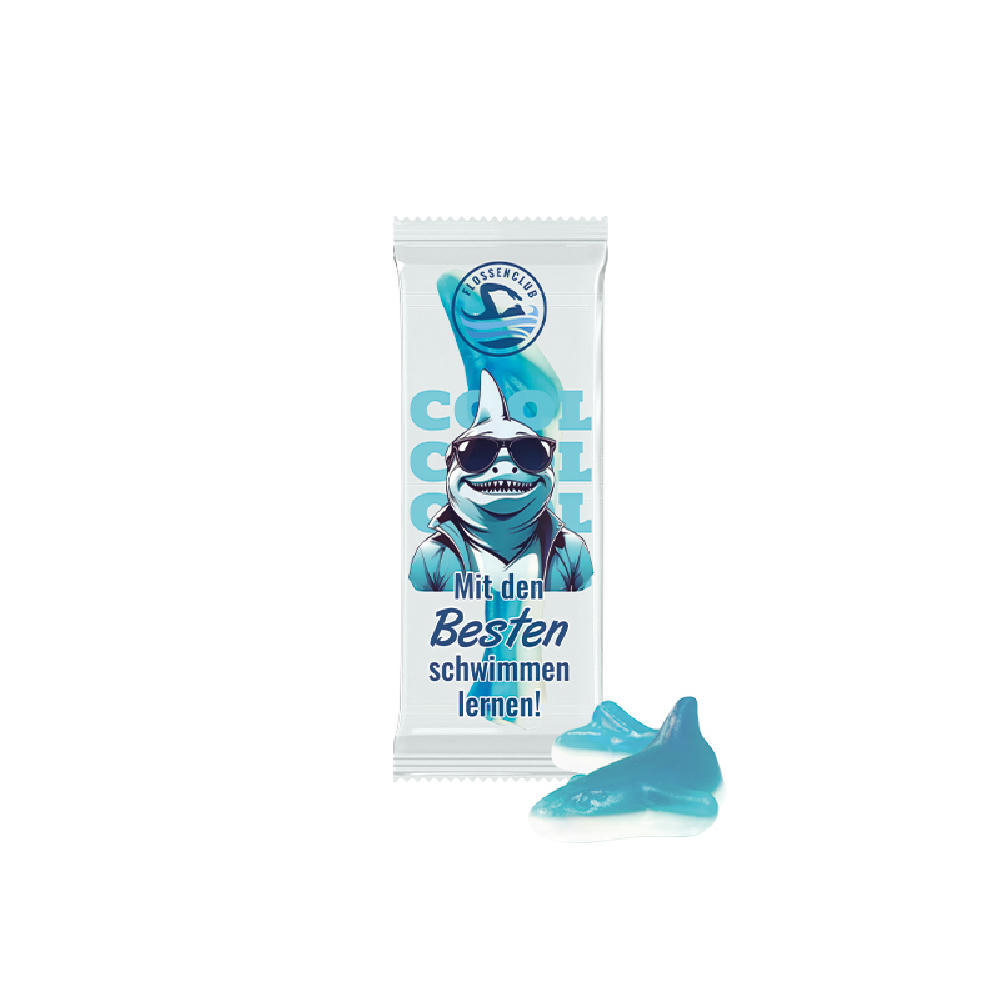 Flowpack aus weißer Folie, individuell bedruckt. Inhalt: 1 Trolli Fruchtgummi "Haifisch" blau, mit weißem Schaumzuckerbauch, Sonderfarben und -geschmacksrichtungen ab 50.000 Stück auf Anfrage, 8 g