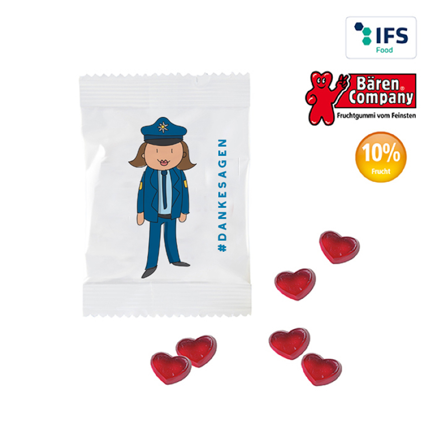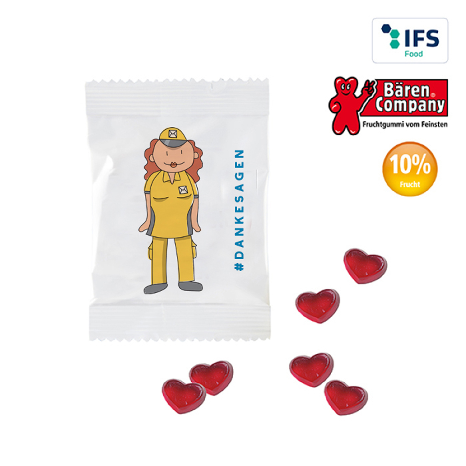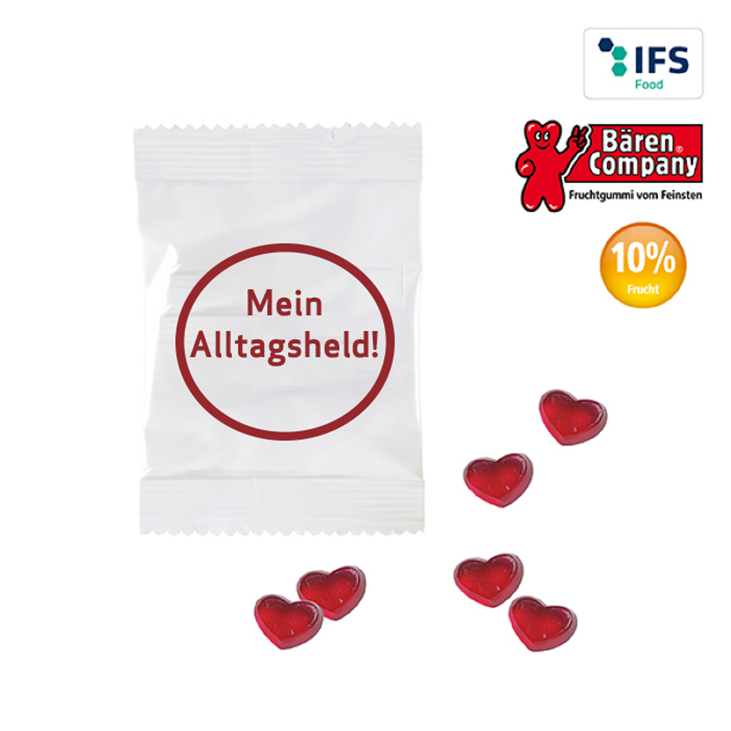 Leckere rote Fruchtgummi-Herzen mit Himbeergeschmack und 10 % Fruchtgehalt aus Fruchtsaftkonzentrat, natürlichen Aromen und färbenden Pflanzenauszügen, in weißem Werbetütchen verpackt. Das Tütchen ist nach Ihren Wünschen bedruckbar.