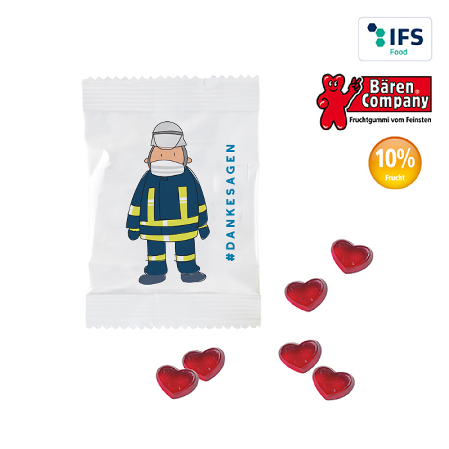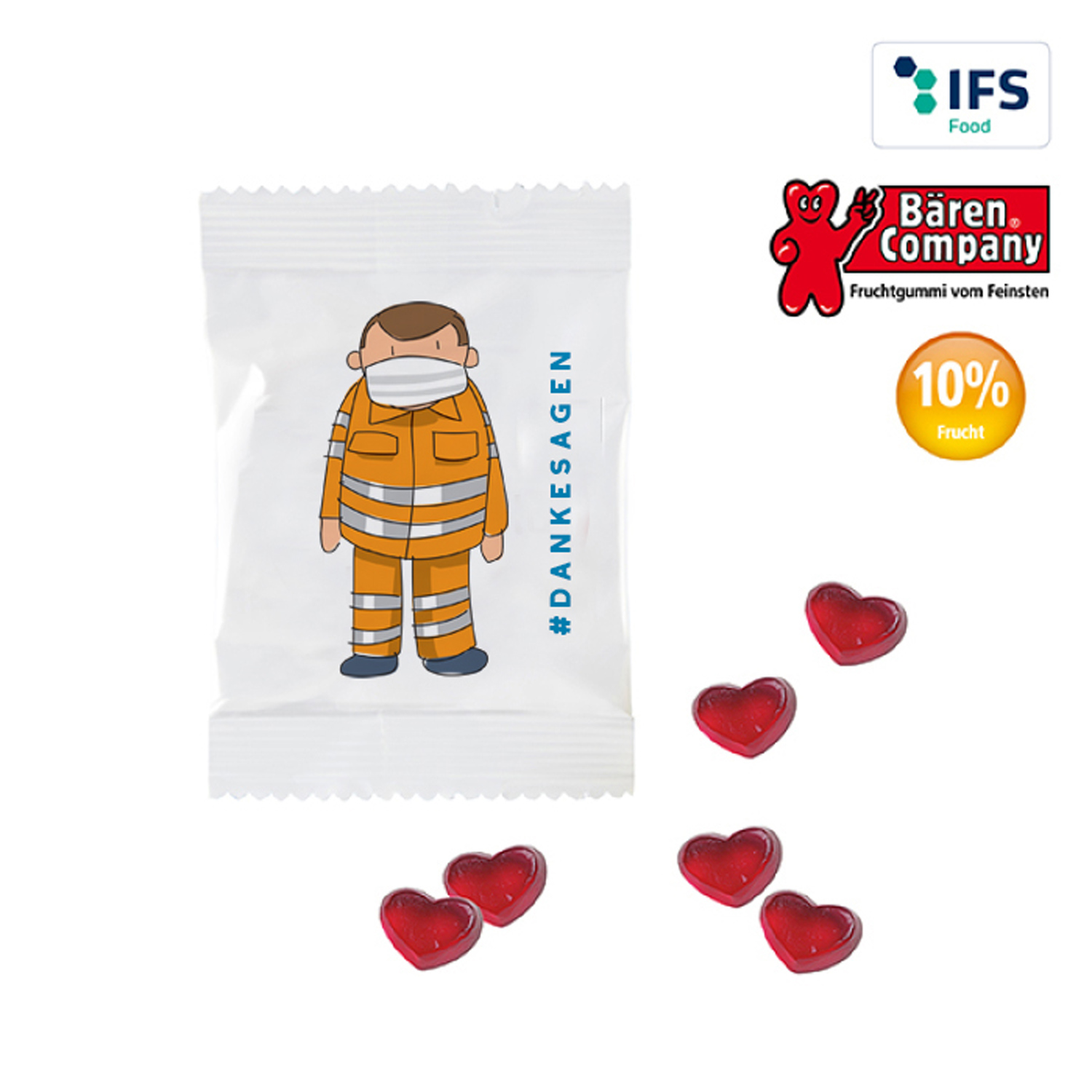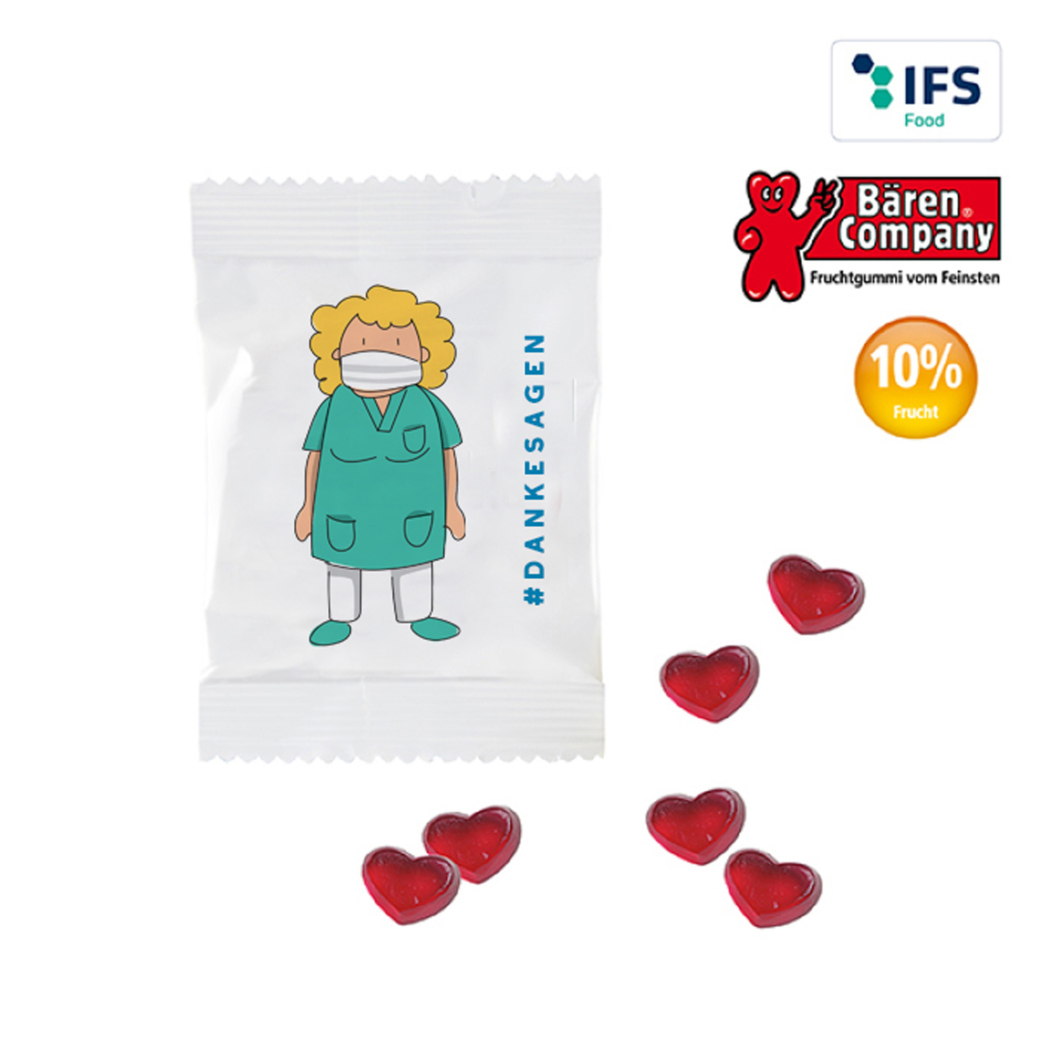 Leckere rote Fruchtgummi-Herzen mit Himbeergeschmack und 10 % Fruchtgehalt aus Fruchtsaftkonzentrat, natürlichen Aromen und färbenden Pflanzenauszügen, in weißem Werbetütchen verpackt. Das Tütchen ist nach Ihren Wünschen bedruckbar.