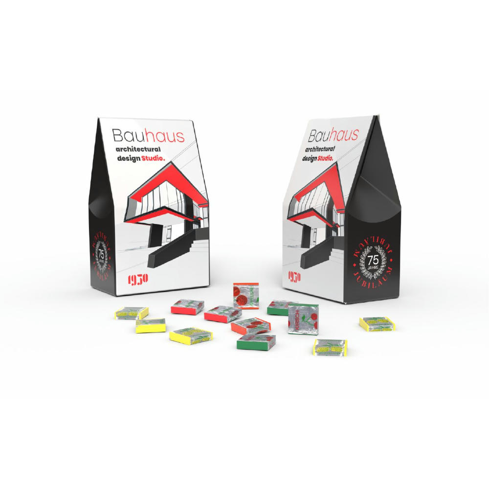Fruchtigen Kaubonbons verpackt in einer hochwertigen Standbodenkartonage. Kartonage rundum veredelbar und aus zertifiziertem Papier. Inkl. 4c-Druck auf der Kartonage.