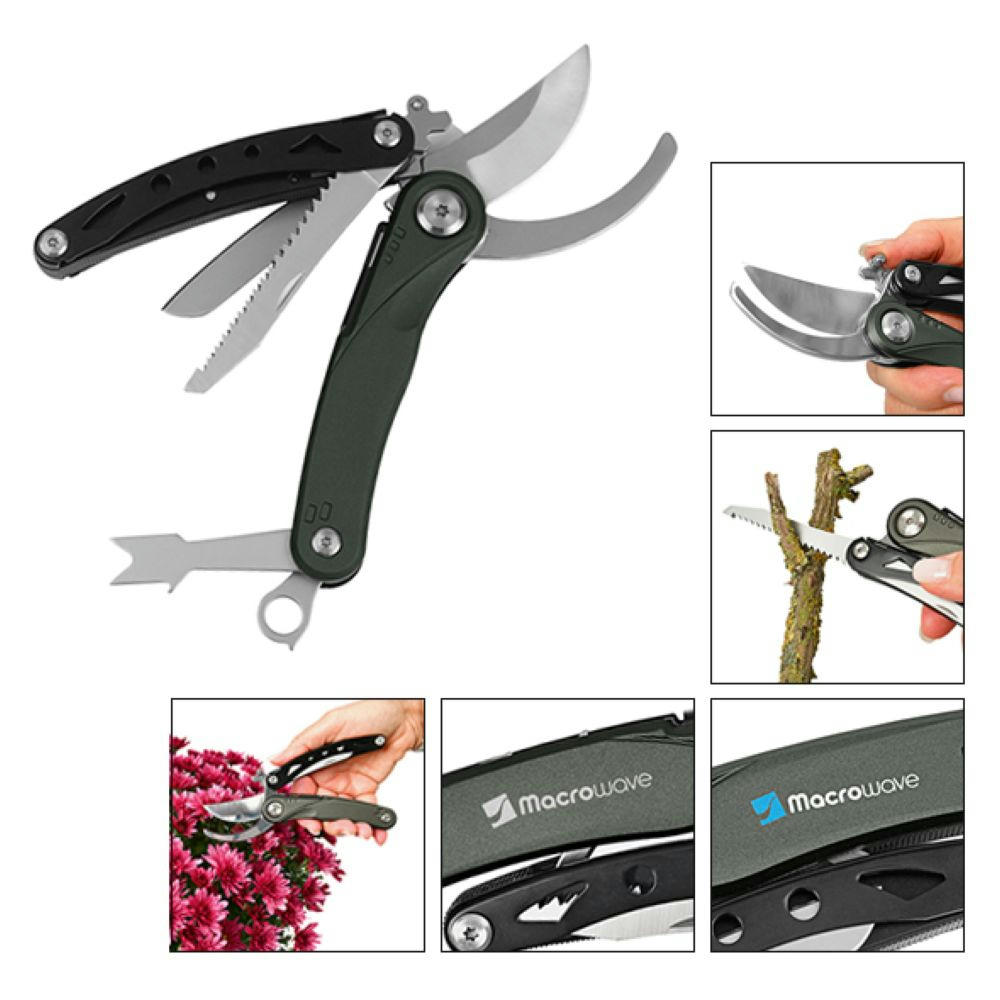 Multifunktions-Gartenschere mit 5 Funktionen: Gartenschere, Messer (Klingenlänge 70 mm), Holzsäge, Wurzelzieher.