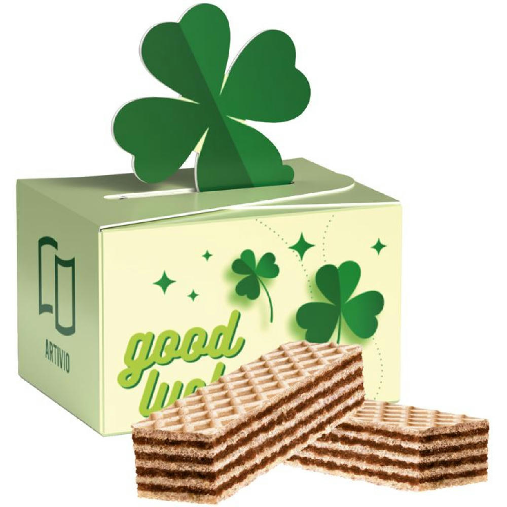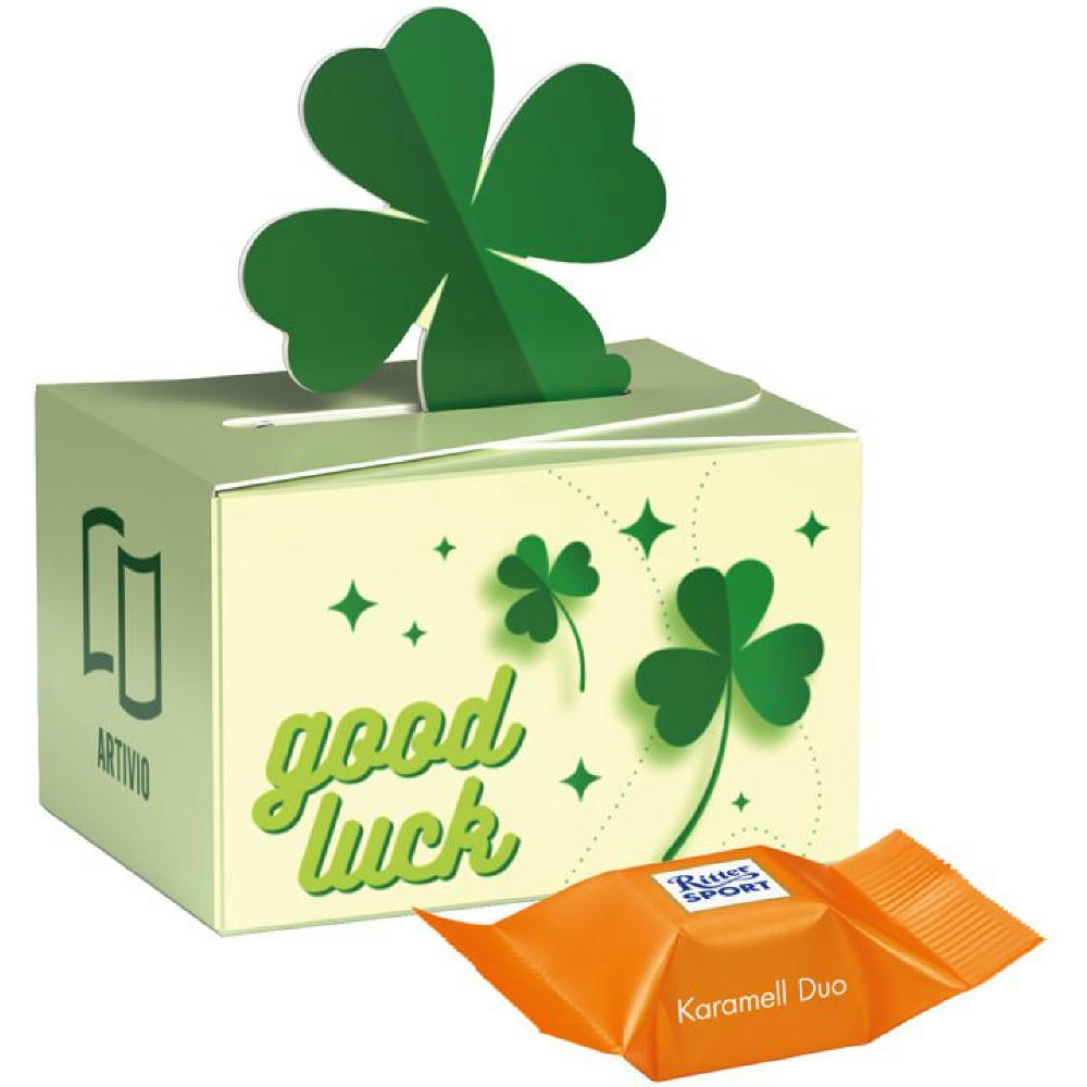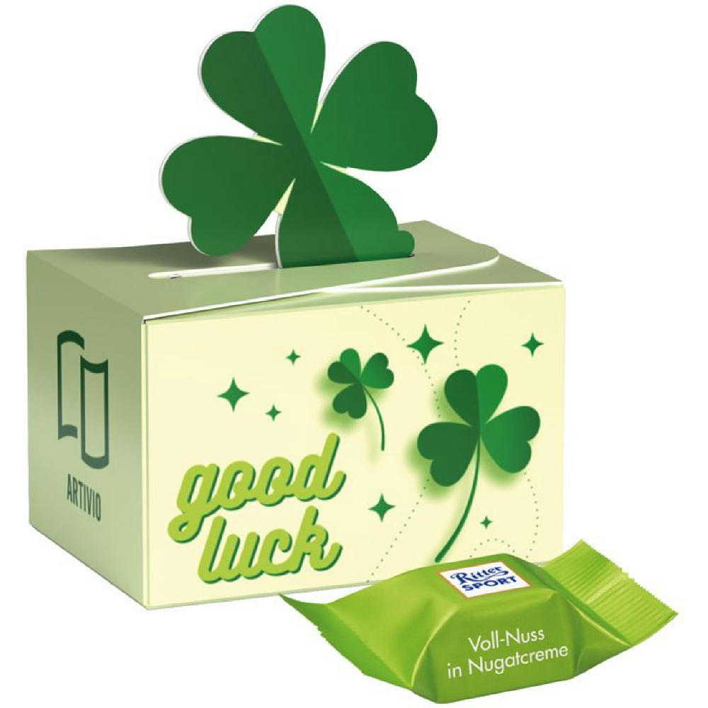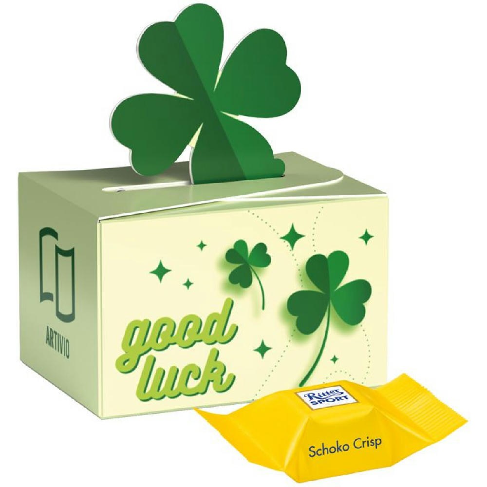 Kleine Werbebox aus weißem Karton, Verschluss mit einem aufgestellten Kleeblatt, Box individuell bedruckt. Andere Aufstellformen und Füllvarianten auf Anfrage. Inhalt: 1 LINDOR Milchkugel, 12,5 g.