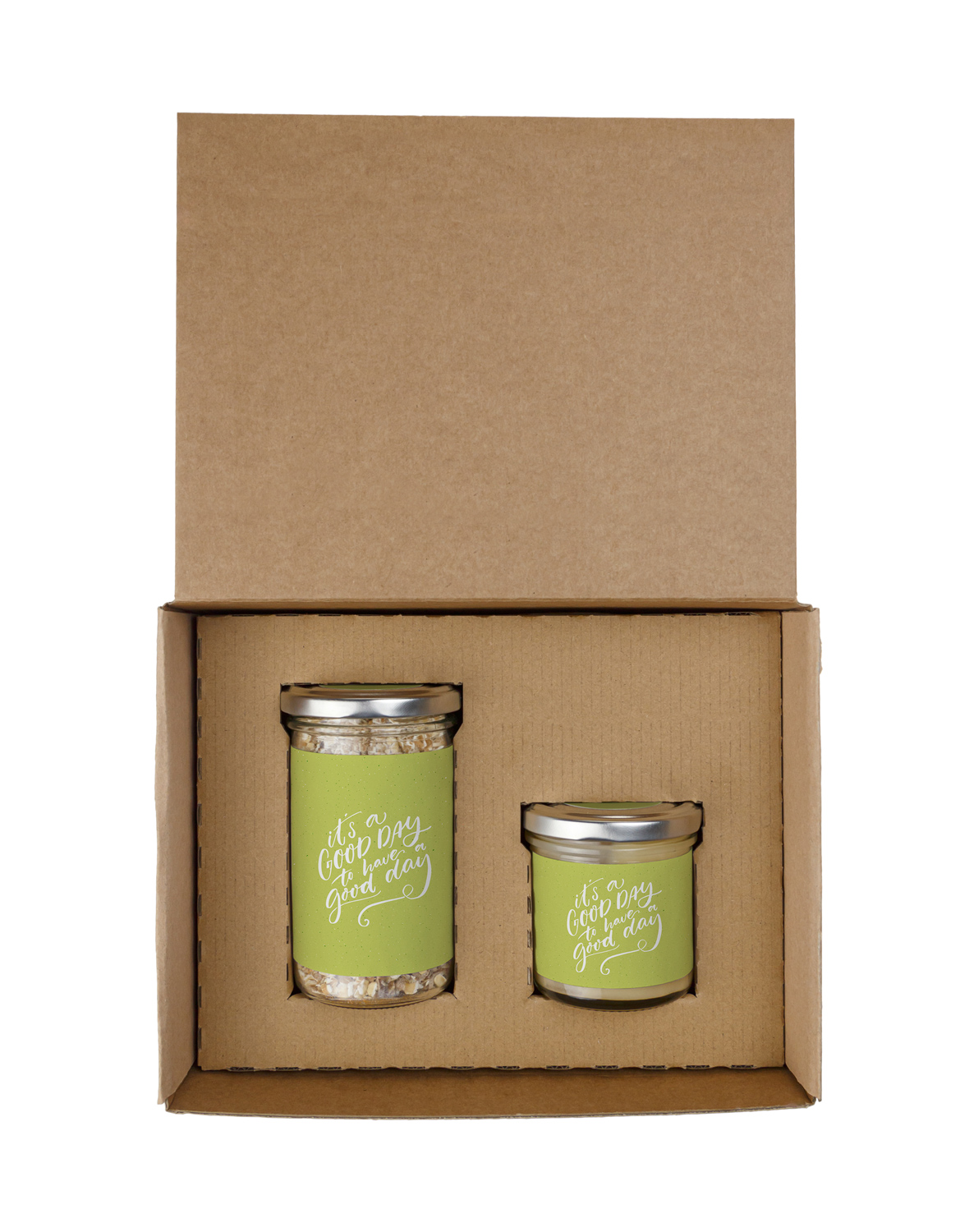 Geschenkbox mit »#maxi low mile« Früchtemüsli von REGIONIQUE und »#midi beeswe.love« Blütenhonig. Made in Germany. Inhalt: 1 x MAXI Früchtemüsli, 130g 1 x MIDI Blütenhonig, 200 g Box aus Kraftkarton mit Inlay. Preis inkl. 4c-bedruckten Etiketten auf Gläsern und Label für die Box.