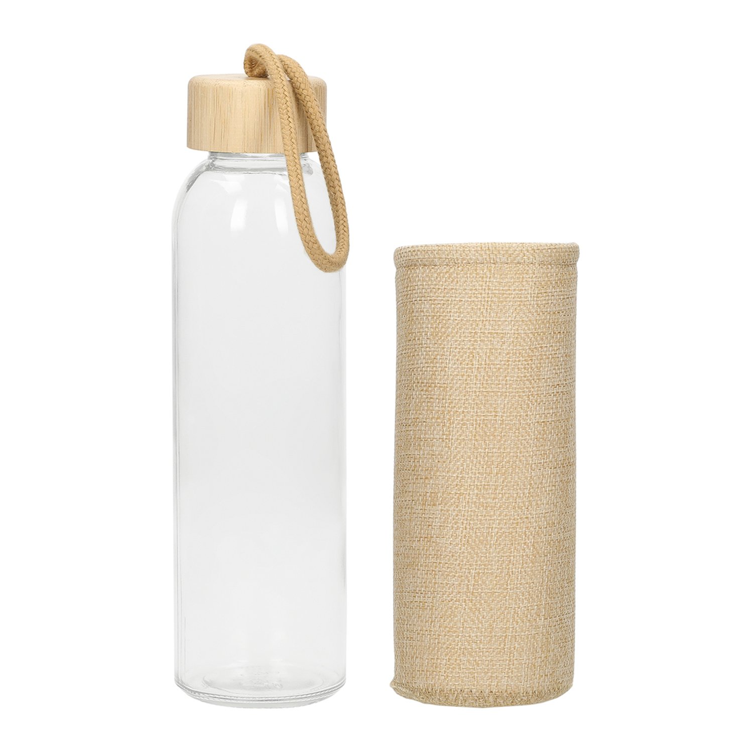 Handliche Trinkflasche aus Sodalime-Glas inklusive Schraubverschluss aus Bambus mit praktischer Schlaufe. Die griffige Hülle in natürlichem Look hält die Temperatur des Getränks länger konstant. Außerdem bietet sie bei heißem Inhalt zusätzlichen Schutz vor der erwärmten Oberfläche. Füllmenge: 0,50 Liter.