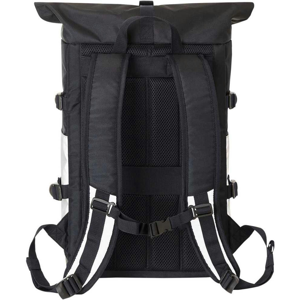 Refektierender Rolltop-Rucksack mit Reißverschluss-Hauptfach und Steckverschluss; HFL®-Träger für Ihr Logo; gepolstertes Einsteckfach und Reißverschluss-Netzfach innen; zwei seitliche Einsteckfächer; Fixiergurte; Reißverschluss-Vortasche; LED-Fahrradlicht-Befestigungsmöglichkeit; rückseitige Befestigungsschlaufe für Trolley-Gestänge; verstecktes Reißverschluss-Fach; gepolstertes Tragesystem mit höhenverstellbarem Brustgurt; Handgriff.