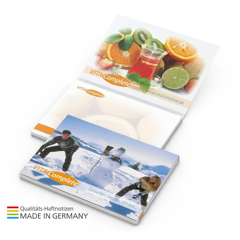 Der günstige Cover Karton im Format 72 x 72 mm oder etwas größer in 100 x 72 mm verpackt die Haftnotizen in einem individuellen Umschlag.
