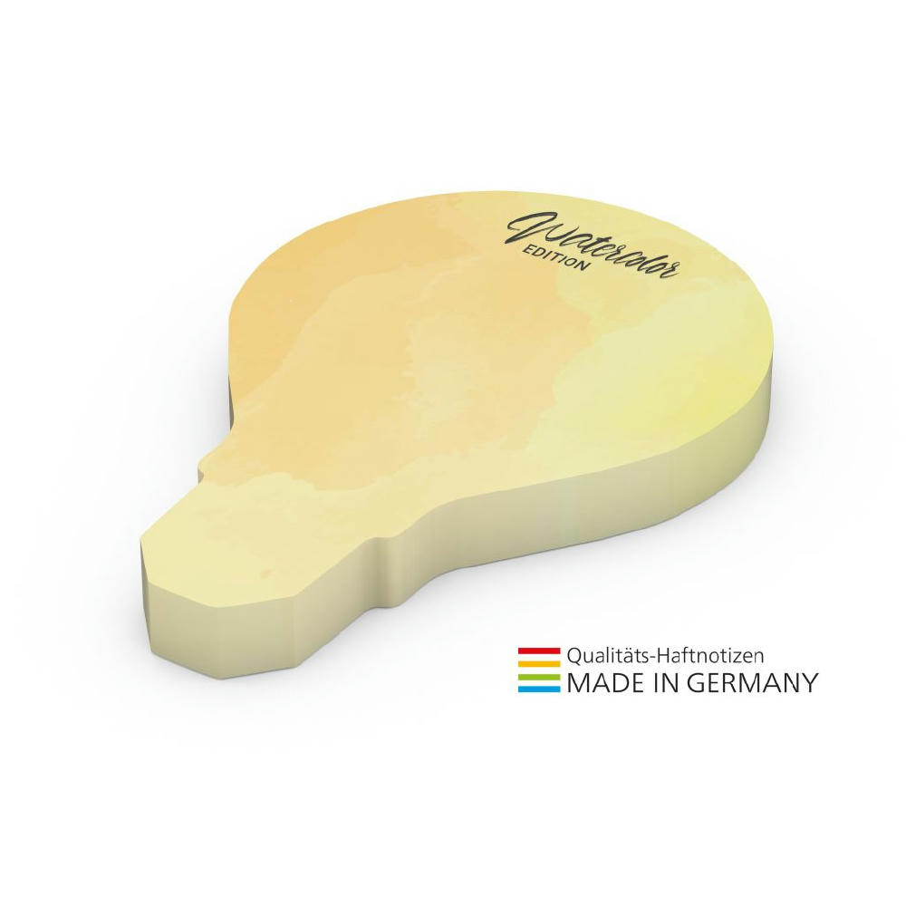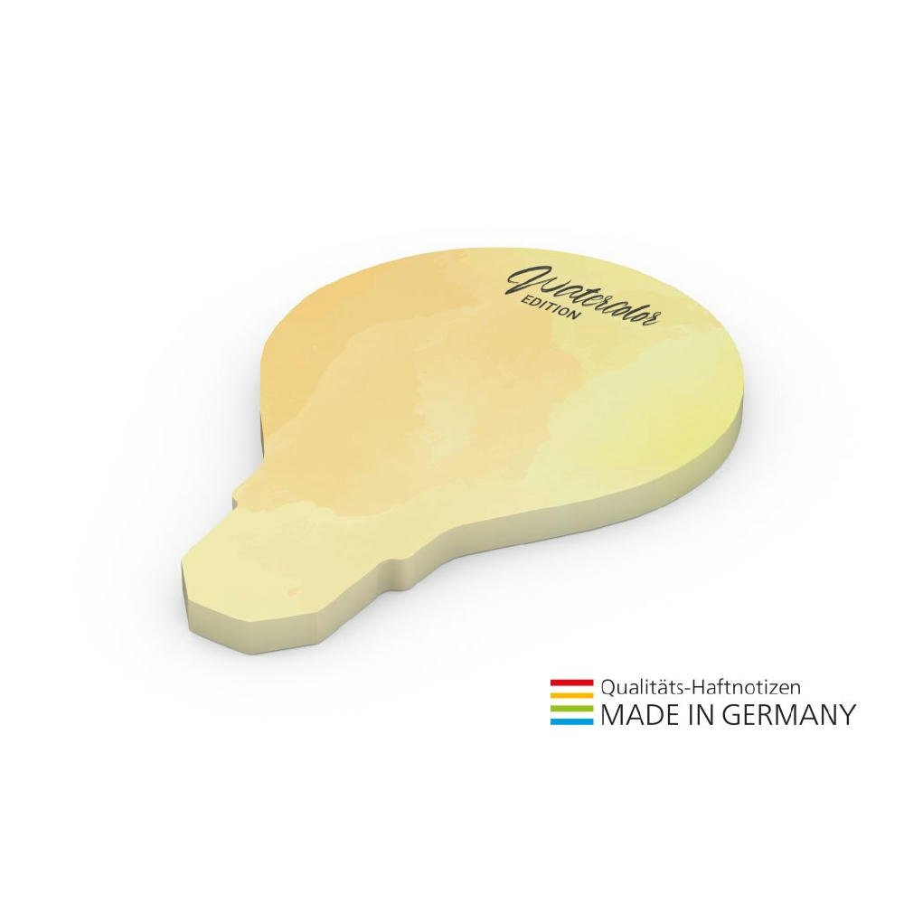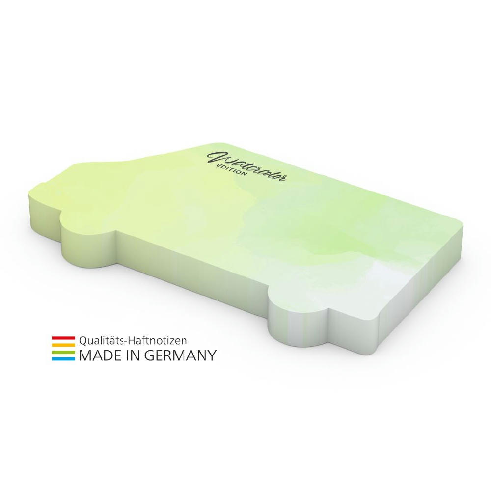 Egal, ob Transporter, Glühbirne oder Daumen-Hoch: Haftnotizblock Form in verschiedenen Formaten, mit wählbarer Formstanzung; 25, 50 oder 100 Blatt individuell bedruckbares Haftpapier – hergestellt aus 100 % Altpapier mit dem Umweltzeichen „Blauer Engel” – Werbeeindruck in 4C-Quality auf den Haftnotizen inklusive