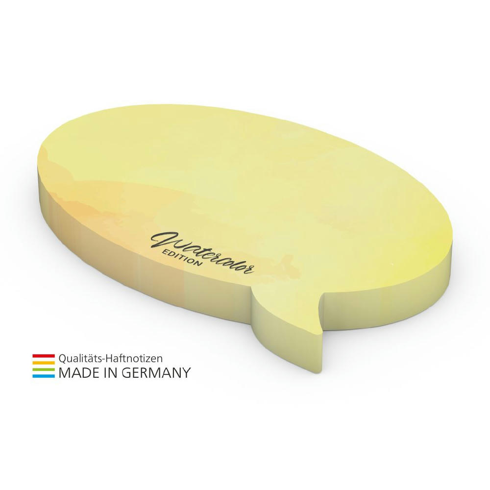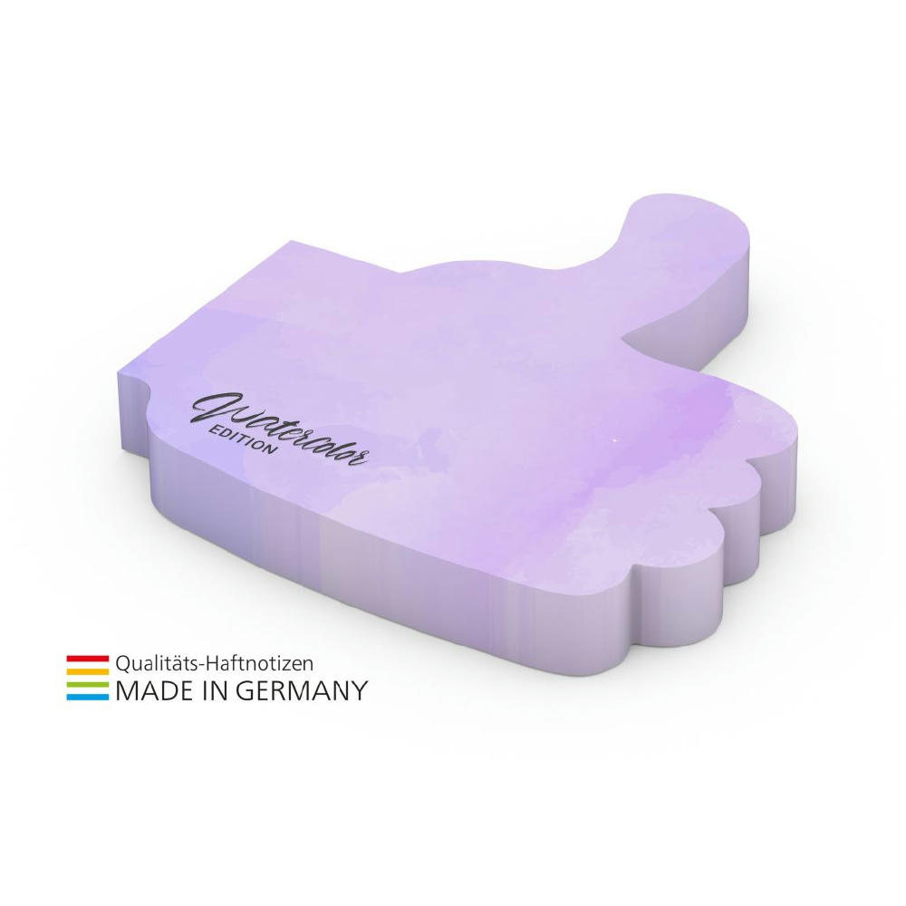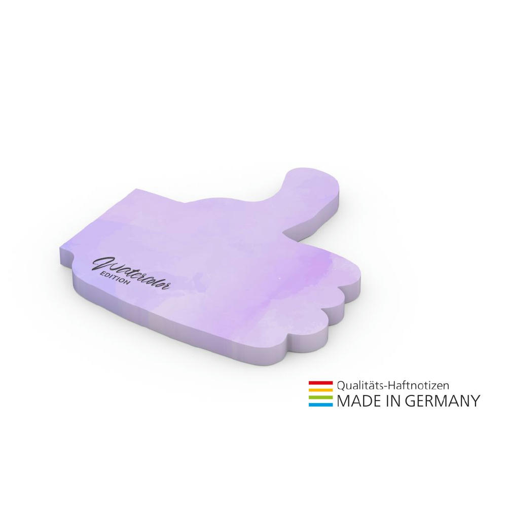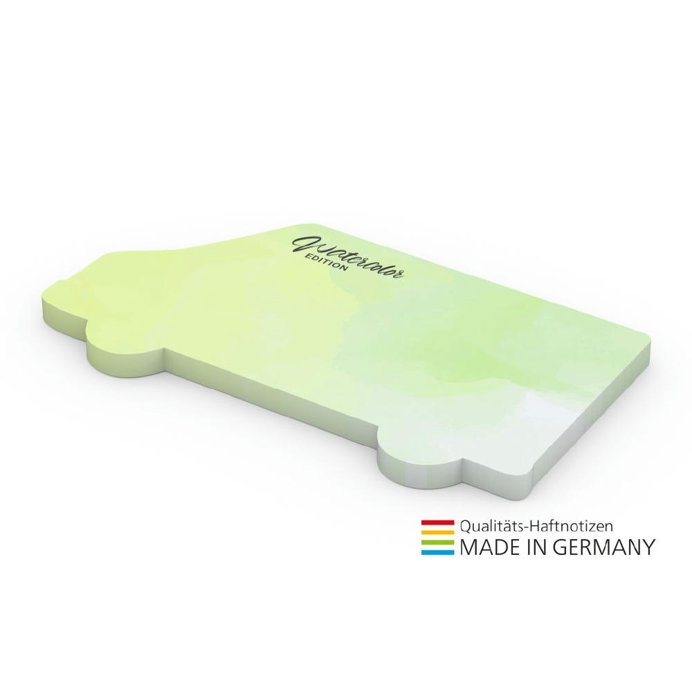 Egal, ob Transporter, Glühbirne oder Daumen-Hoch: Haftnotizblock Form in verschiedenen Formaten, mit wählbarer Formstanzung; 25, 50 oder 100 Blatt individuell bedruckbares Haftpapier – hergestellt aus 100 % Altpapier mit dem Umweltzeichen „Blauer Engel” – Werbeeindruck in 4C-Quality auf den Haftnotizen inklusive