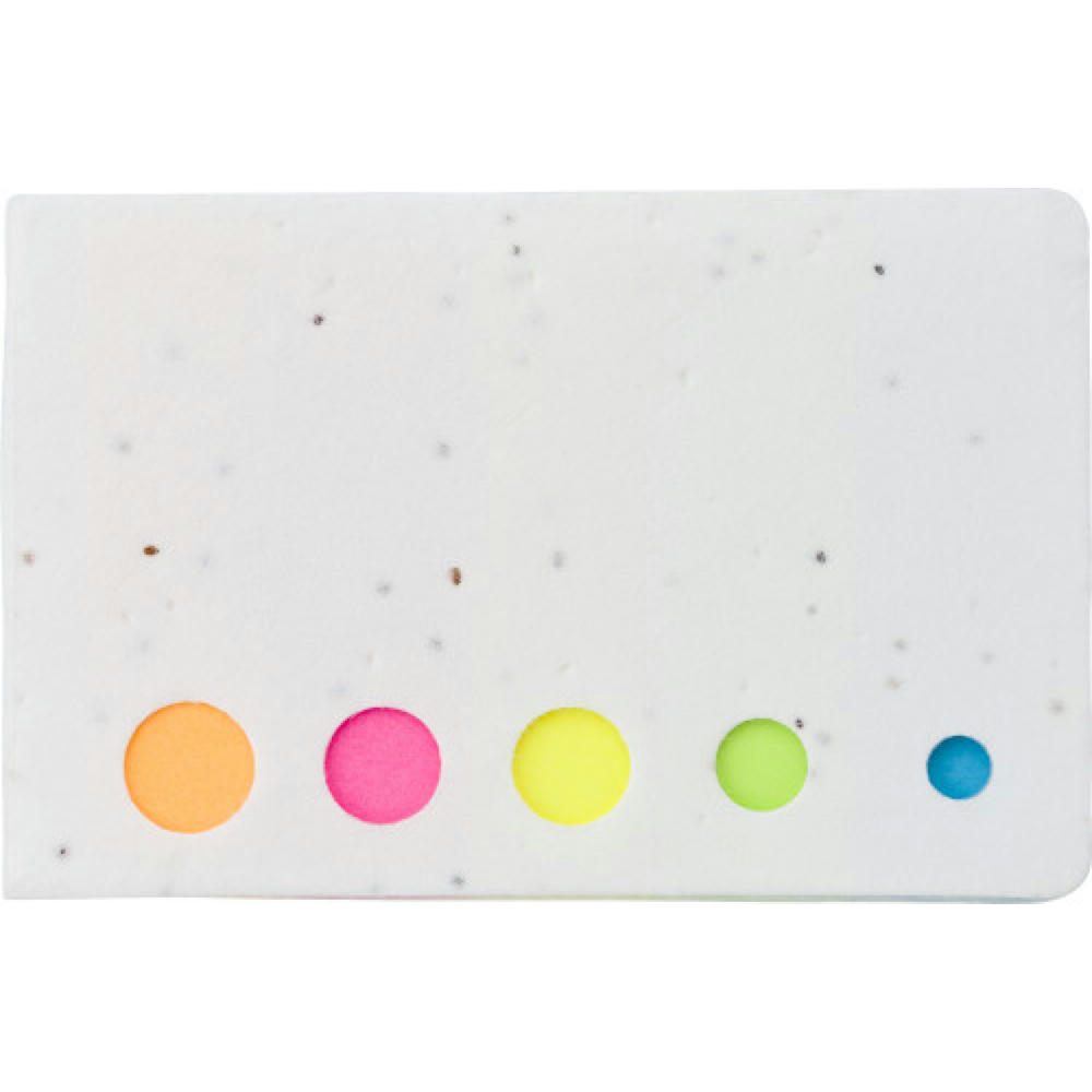 Haftnotizen mit Umschlag aus Saatgutpapier mit Mohnblumen. Fünf Farben von kleinen Haftnotizen.