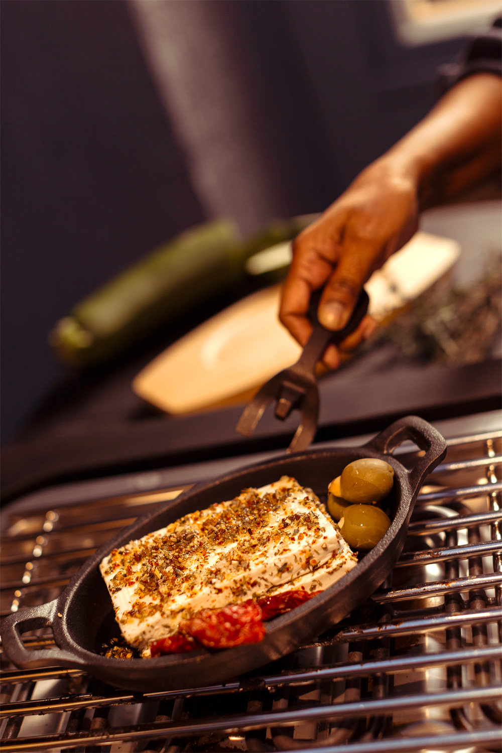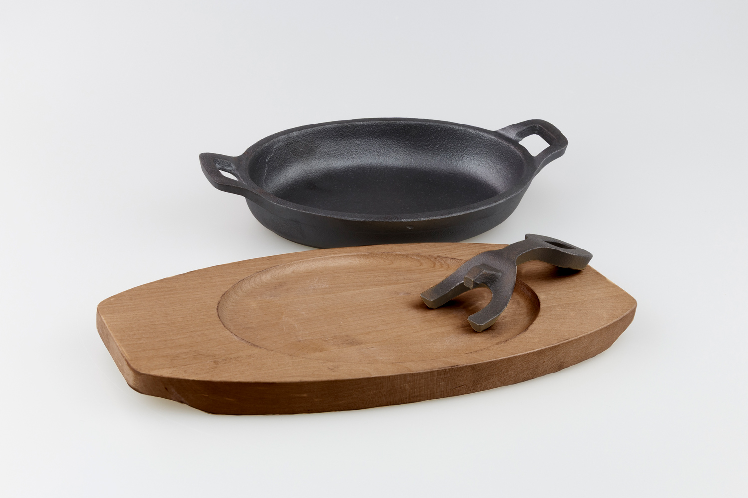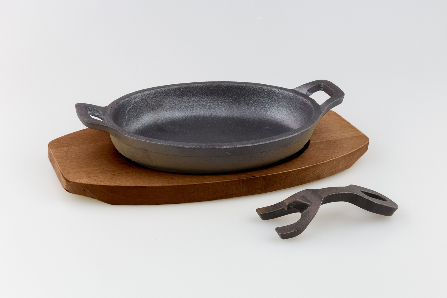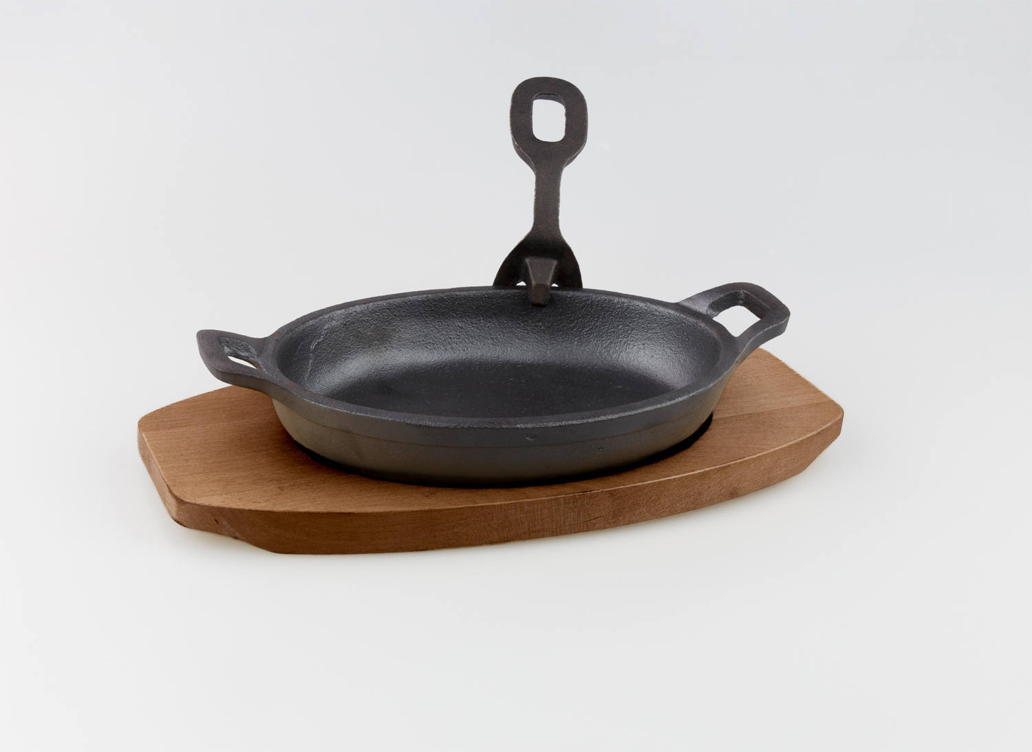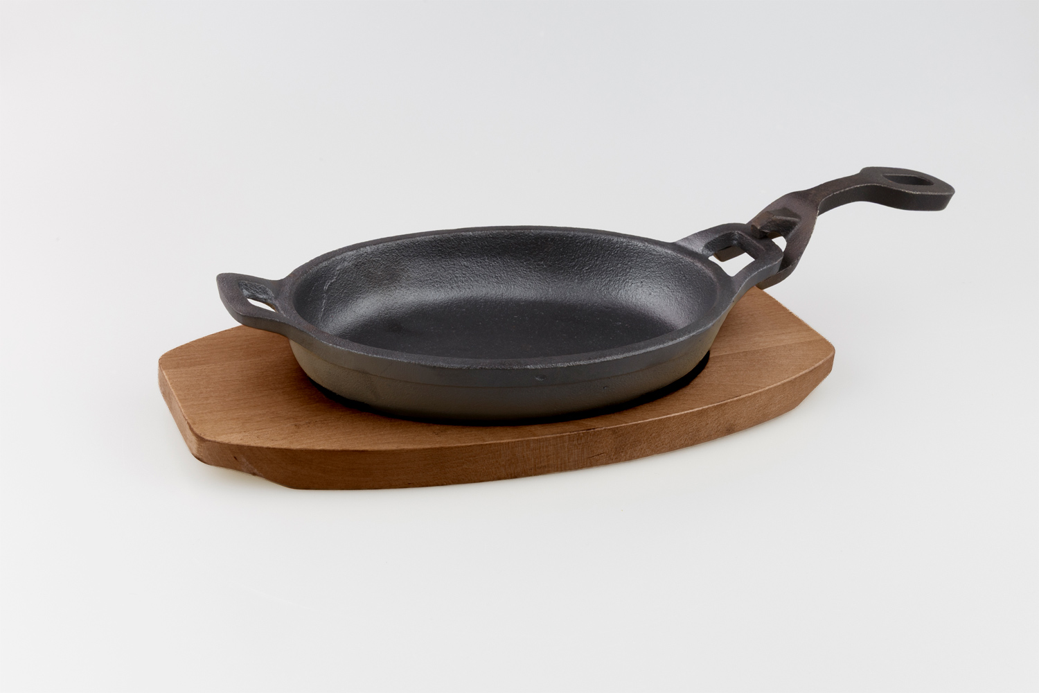 Rustikales Servierset mit gusseiserner Pfanne, abnehmbarem Griff und Akazienholzbrett. Ideal für Grill, Herd oder Ofen. Das Gusseisen garantiert gleichmäßiges Garen und hält Speisen lange warm.