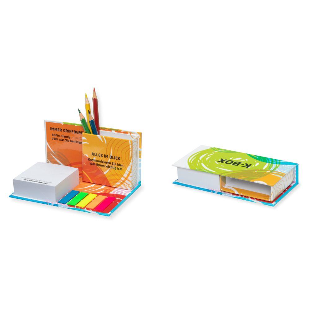 Inhalt: Notizblock (225 Blatt), Indexstreifen (5 x 25 St.) und Ablage für Schreibgeräte. Einzeln mit neutraler Banderole verschlossen. Außen- und Innenflächen der Box 4c-gestaltbar, Notizblock/Haftnotizen 1–2c bedruckbar. Preis inkl. Werbeanbringung.