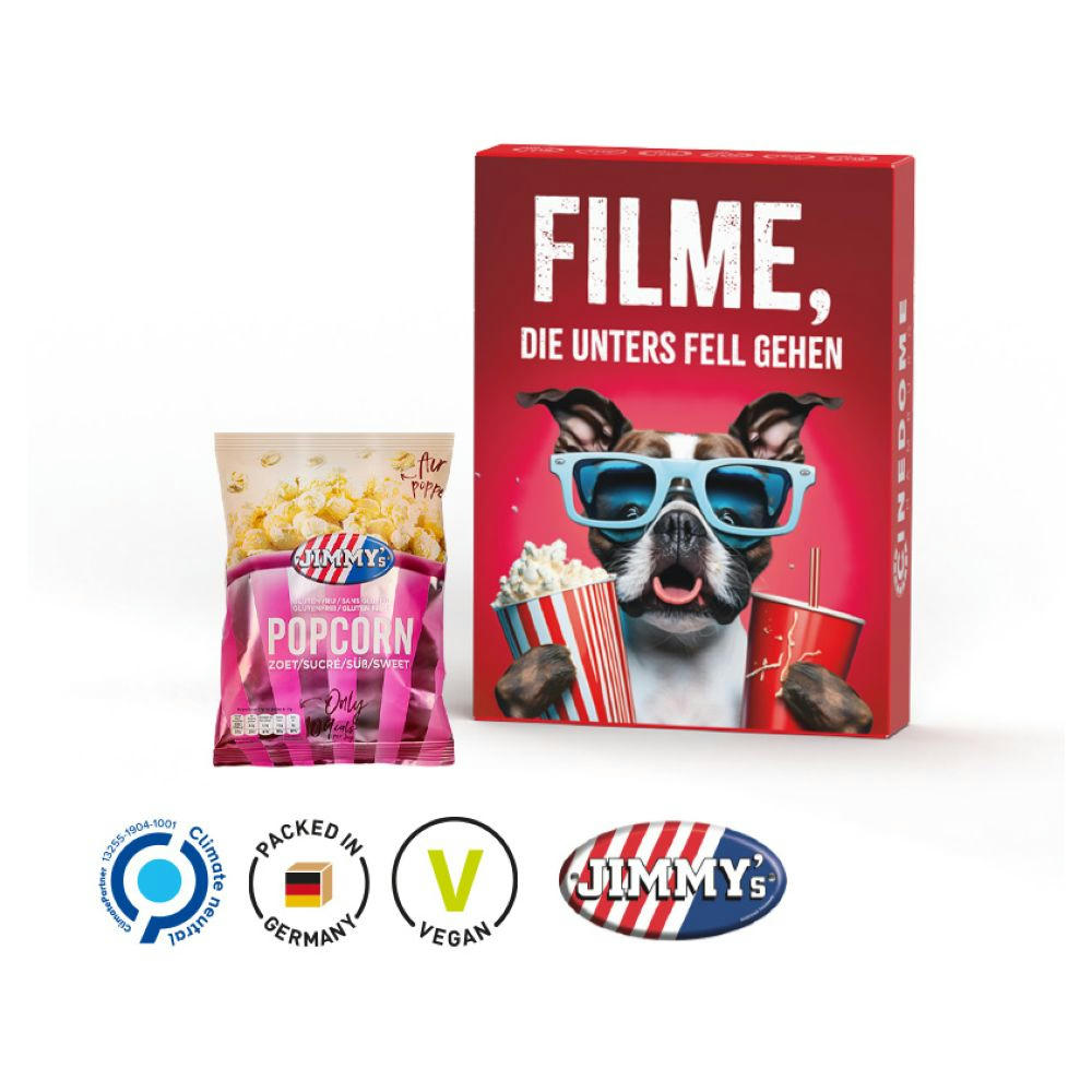 2 Packungen JIMMY's Popcorn in der Sorte Süß, in der Klappschachtel aus weißem Karton, individuell bedruckt, 54 g, Haltbarkeit 3 Monate. Preis inkl. 4-c Druck.