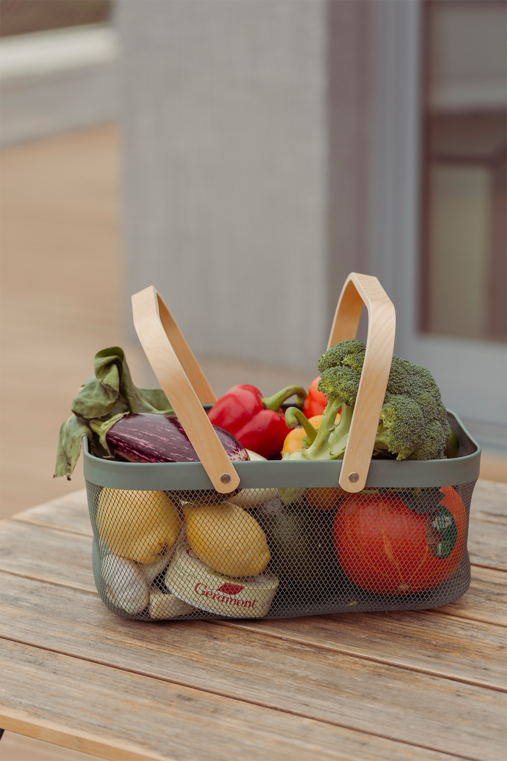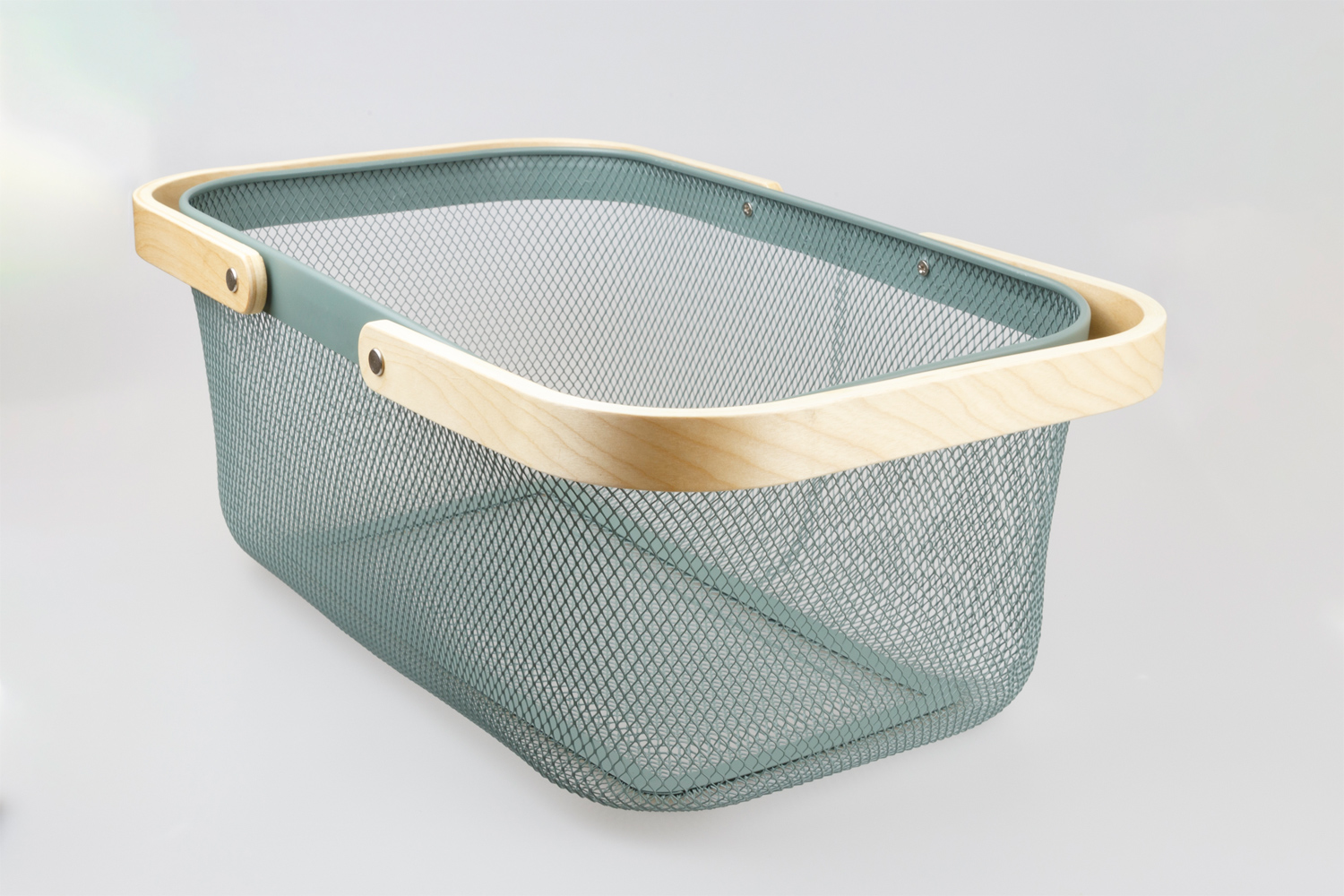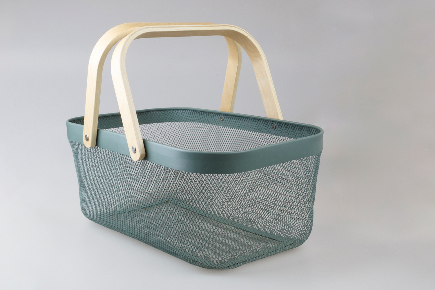 Großer, salbeifarbener Aufbewahrungskorb aus stabilem Stahlgeflecht mit Griffen aus Bambusholz. Perfekt als stilvolle Aufbewahrungslösung für Arbeits- oder Hobbysachen, oder als Einkaufskorb für den Marktbesuch.
