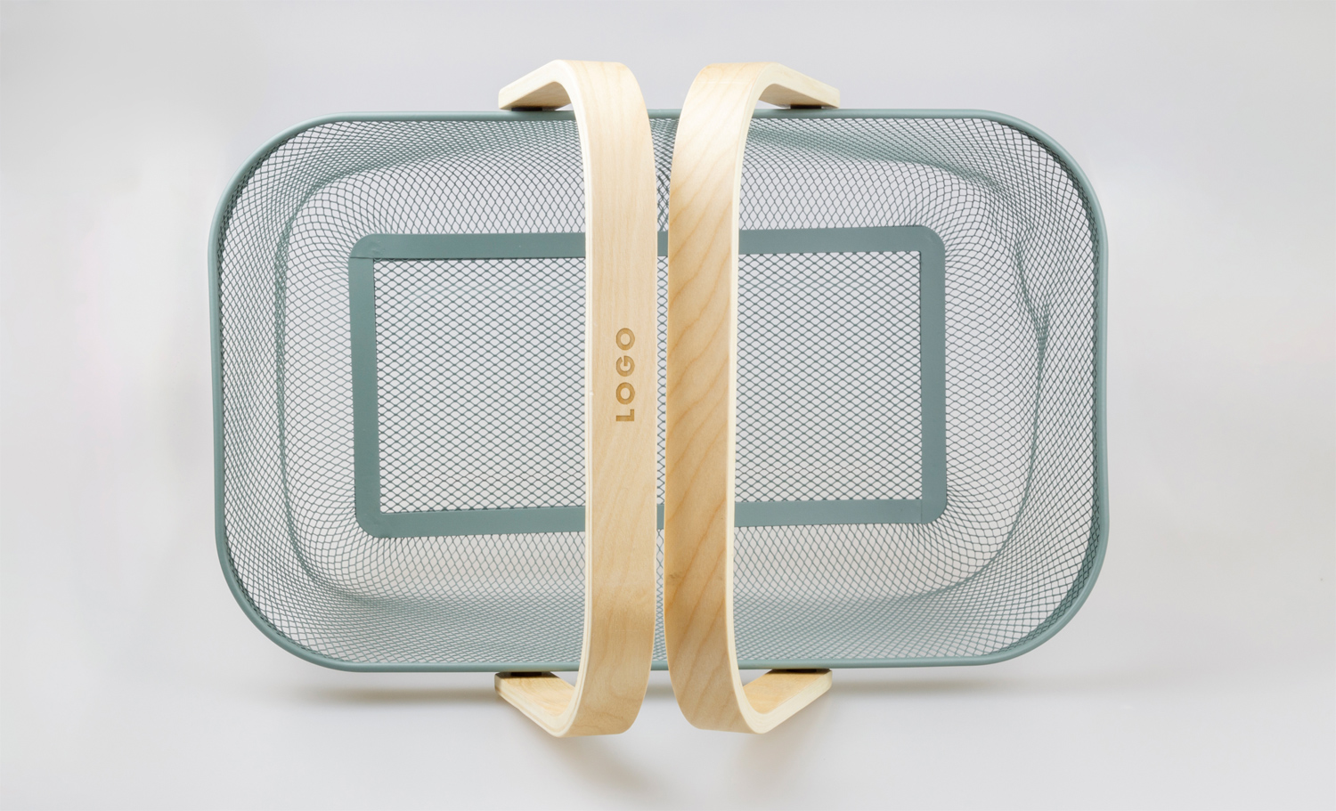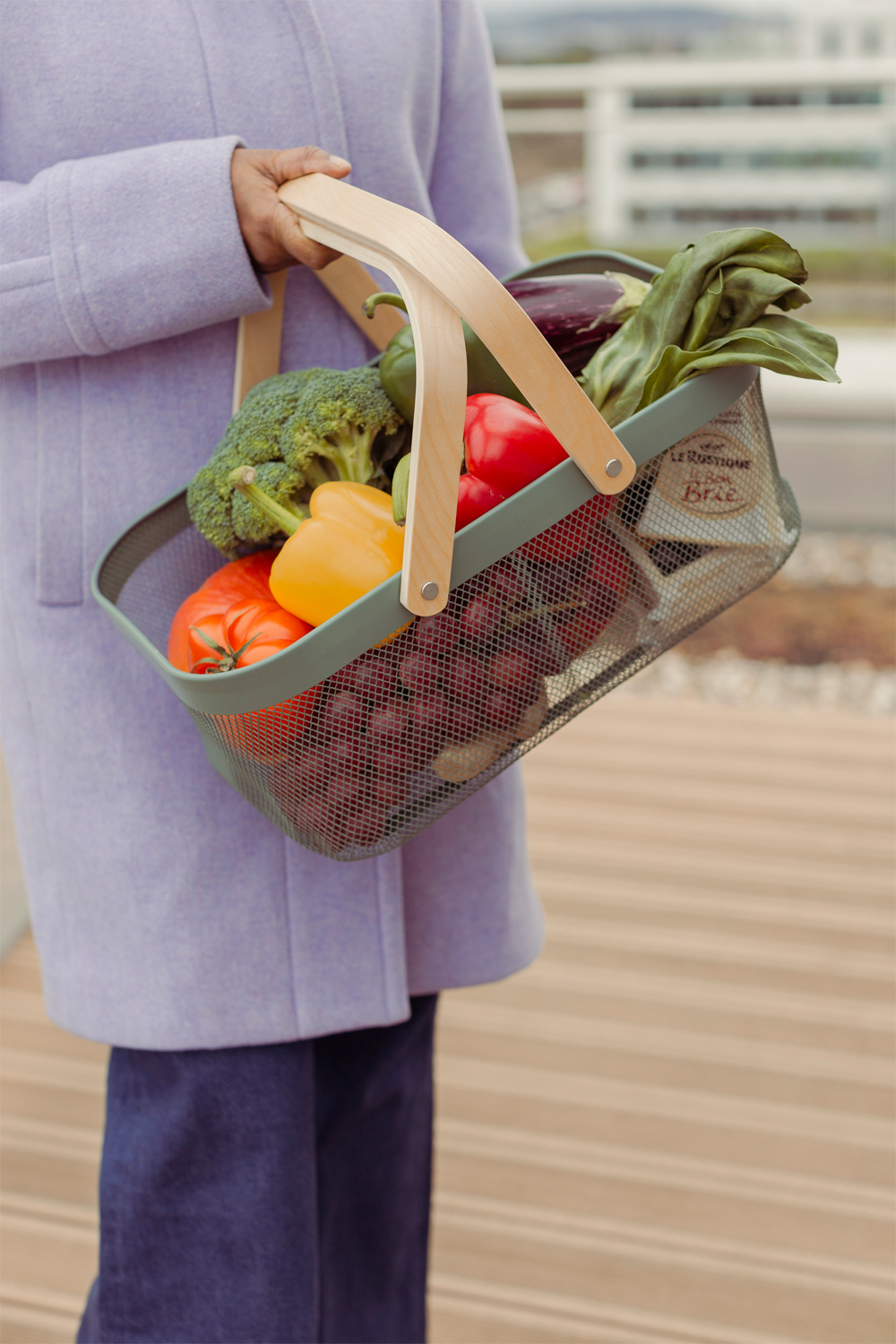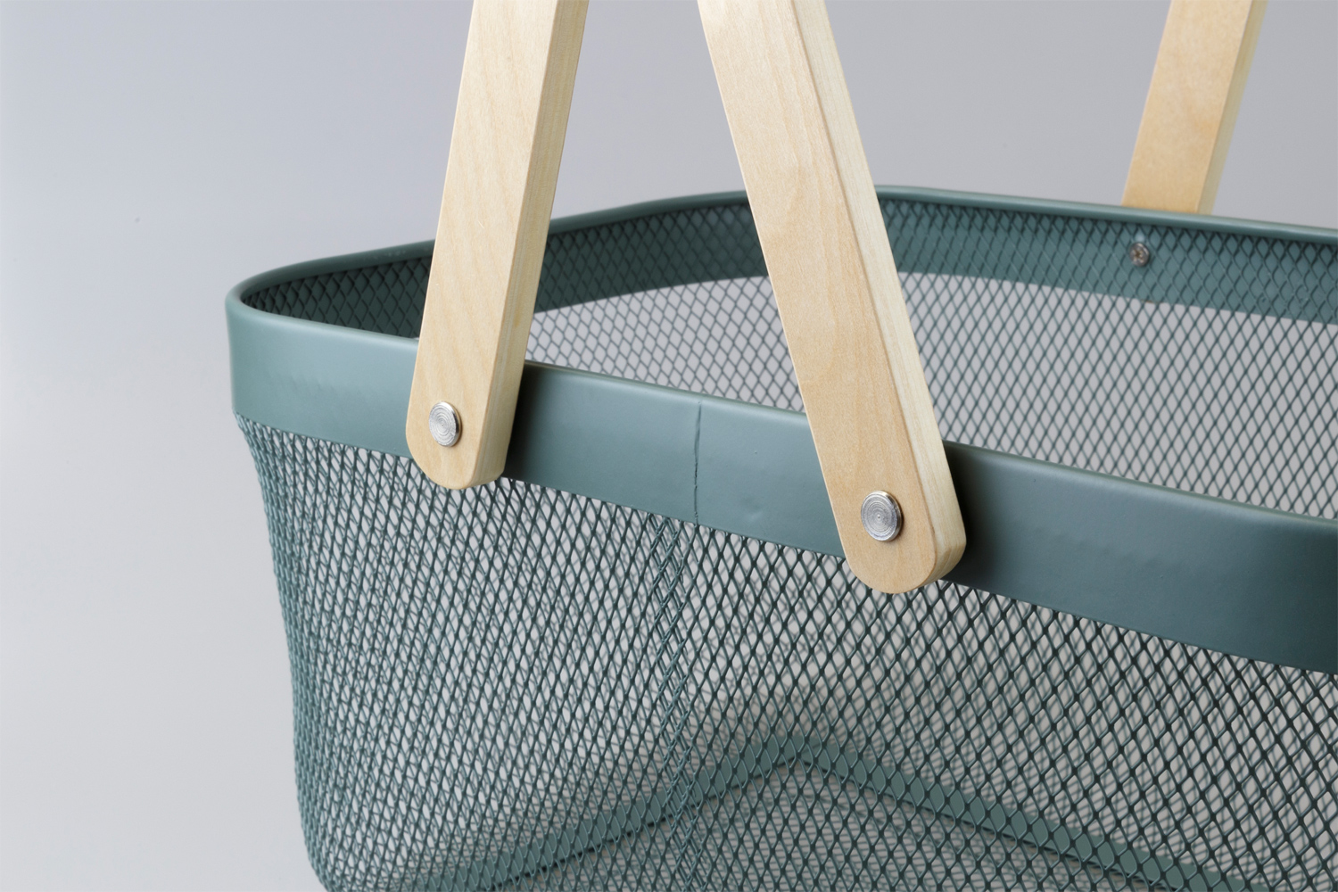 Großer, salbeifarbener Aufbewahrungskorb aus stabilem Stahlgeflecht mit Griffen aus Bambusholz. Perfekt als stilvolle Aufbewahrungslösung für Arbeits- oder Hobbysachen, oder als Einkaufskorb für den Marktbesuch.