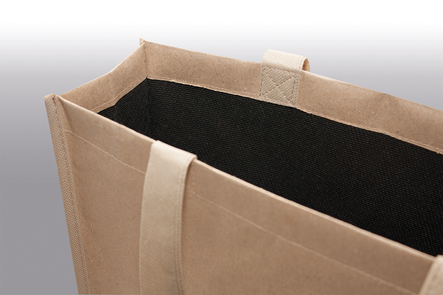 Reißfeste Tasche aus einer besonders langlebigen Materialfusion mit Non-woven (150 g/m²) innen und recyceltem Kraftpapier außen. Henkel: 60cm.