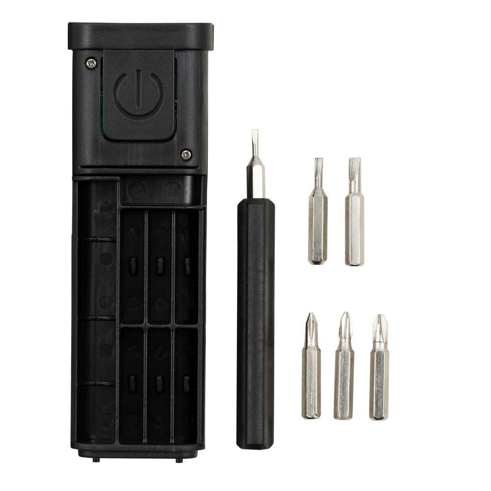 Die Leuchte ist 80 Lumen stark und über einen leicht bedienbaren An/Aus-Knopf zu steuern. Das rechteckige Kästchen aus eloxiertem Aluminium lässt sich aufschieben und enthält sechs Bits und einen Bithalter. Enthalten sind jeweils drei verschiedene Größen eines Kreuz- und Schlitzschrauben-Bits. Inkl. Gürtelclip.