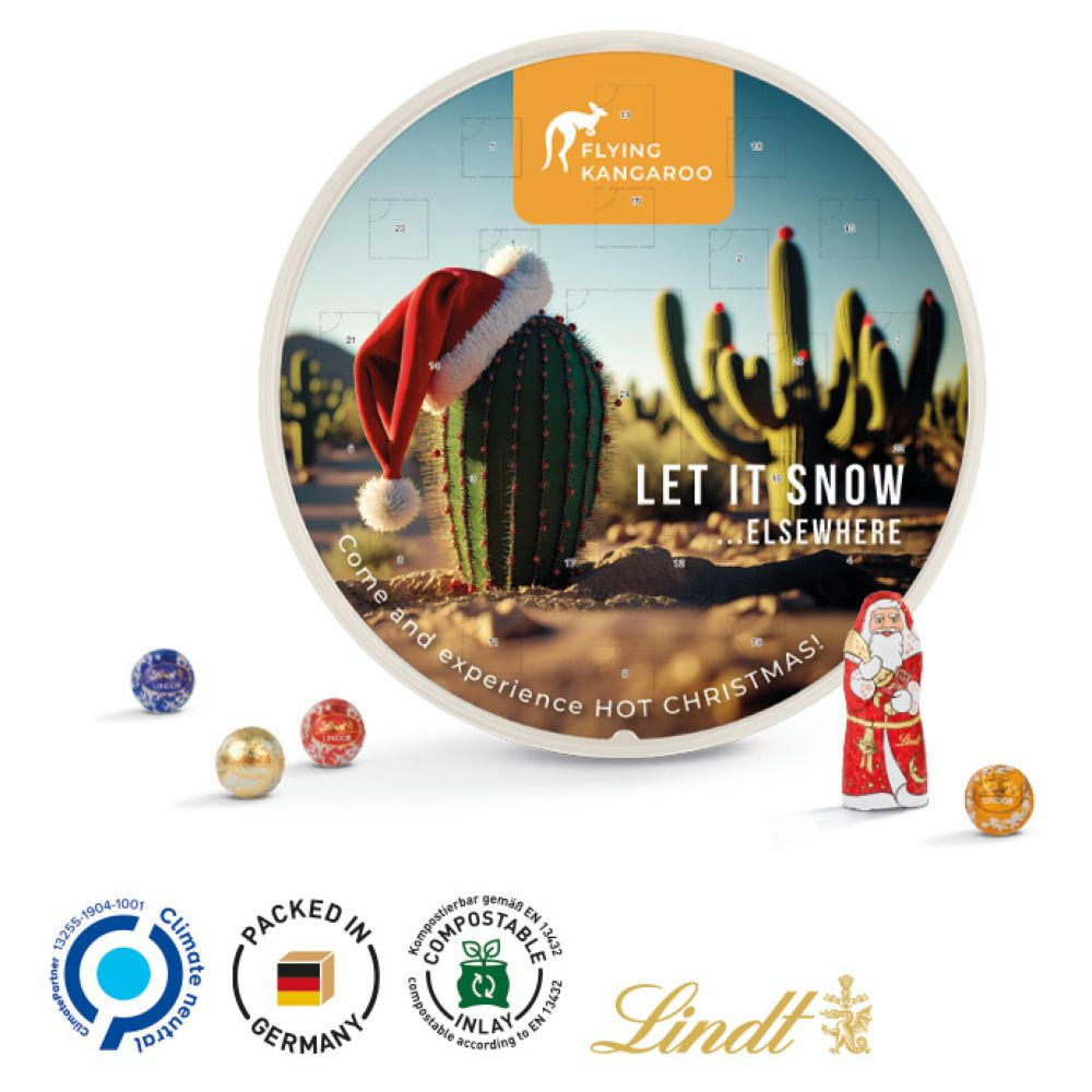 Runder Adventskalender mit Deckblatt mit kompostierbarem Innenteil, individuell bedruckt. Tiefziehteil in Créme-Weiß mit ausklappbarem Tischaufsteller und Aufhänger im Rücken integriert. Inhalt: 23 LINDOR Mini Kugeln der Marke LINDT, bunt gemischt. Hinter dem 24. Türchen verbirgt sich ein 10 g LINDT Weihnachtsmann, 113 g