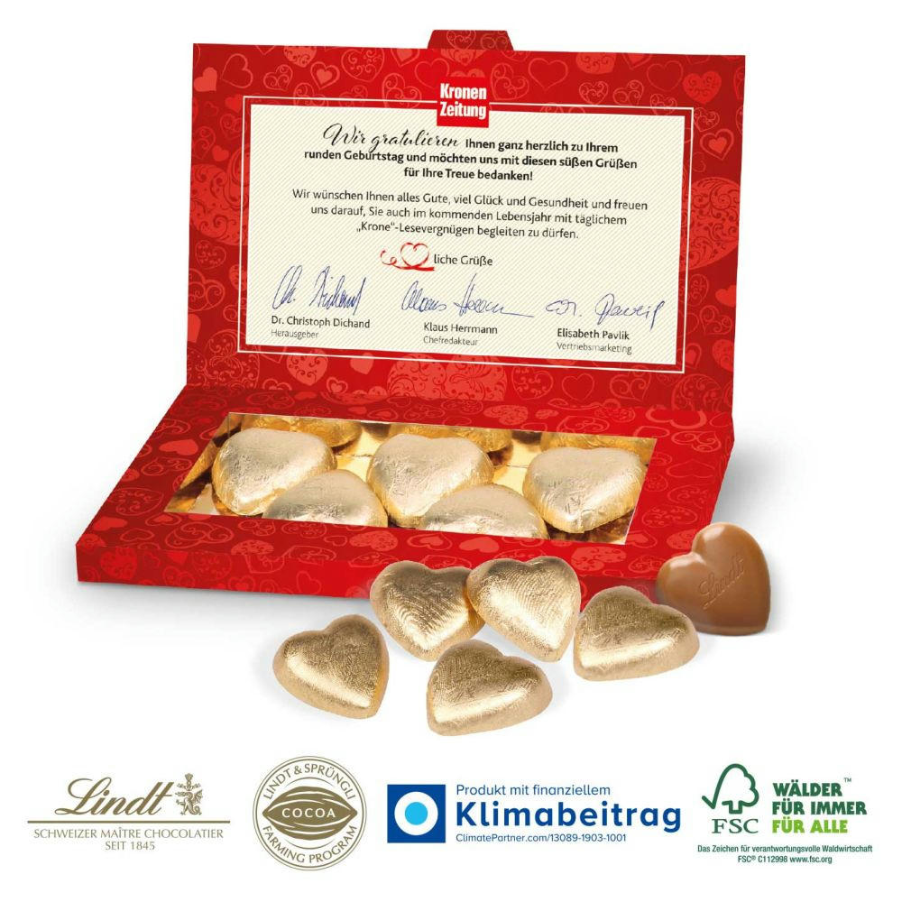 Schokolade von LINDT, verpackt in einer individuellen Werbekartonage. 5 Schokoherzen (ca. 25 g, gold) „Vollmilch“ von LINDT. Produkt mit finanziellem Klimabeitrag. Preis inkl. 4c-Druck.
