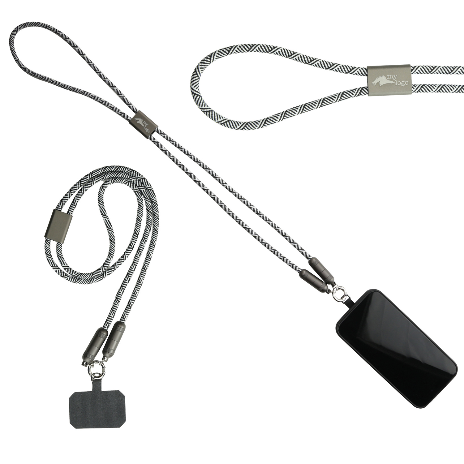 Stabiles Premium Lanyard-Ladekabel mit Smartphone Halterung. USB Type-C auf Type-C Anschluss. Schnelles Laden und Datentransfer mit bis zu 100W.