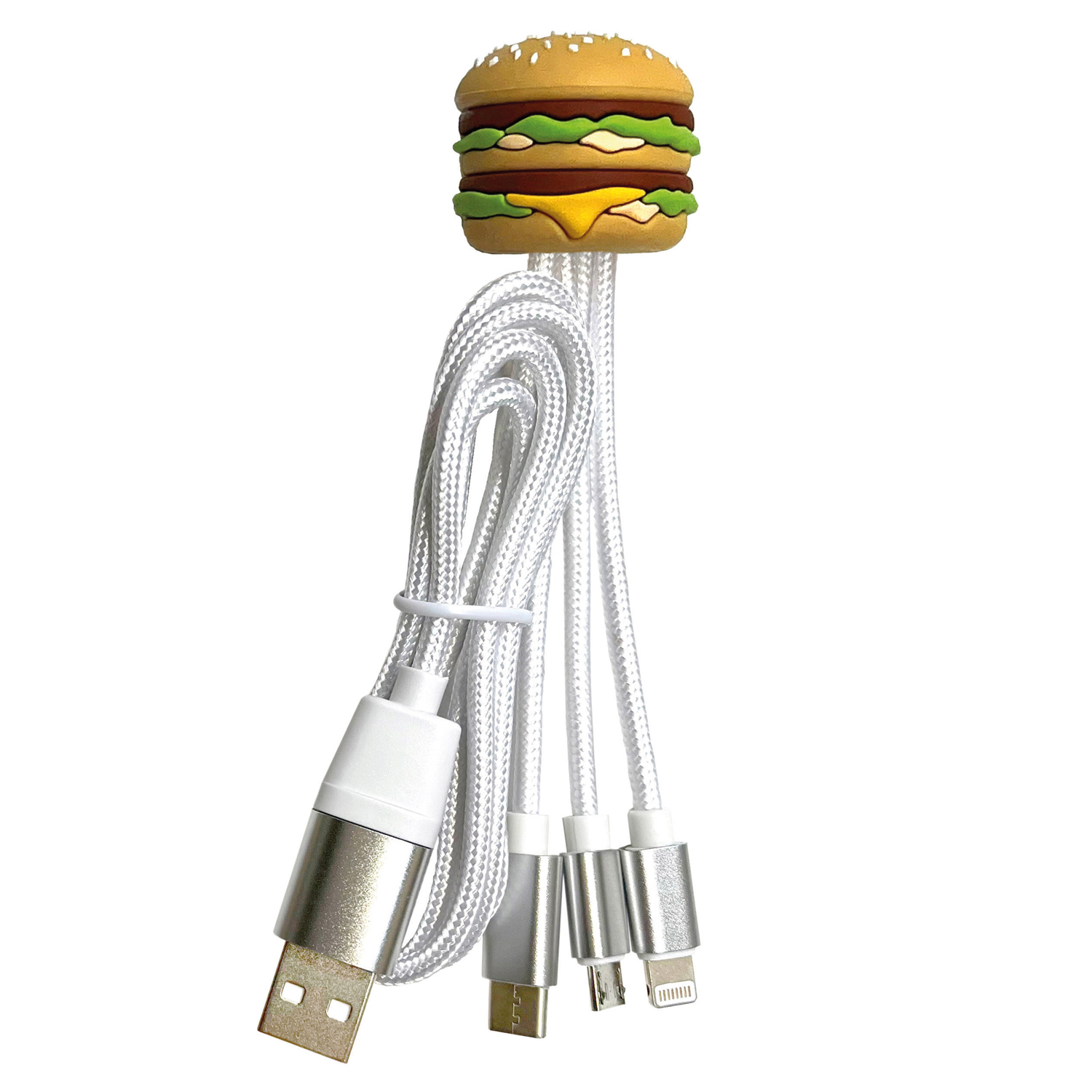 Innovatives 5-in-1 Ladekabel mit vielseitigen Anschlüssen: USB-A mit einem USB Typ C Adapter als Eingang und Ausgänge für iPhone Lightning, Type C sowie Micro USB. Kabel und Stecker wahlweise in Schwarz oder Silber. Der mittlere Teil kann in Größe, Farbe und Design individuell gestaltet werden – die Optionen sind nahezu unbegrenzt! Leistung: 5V / 2.1A; Länge: ca. 110 cm.